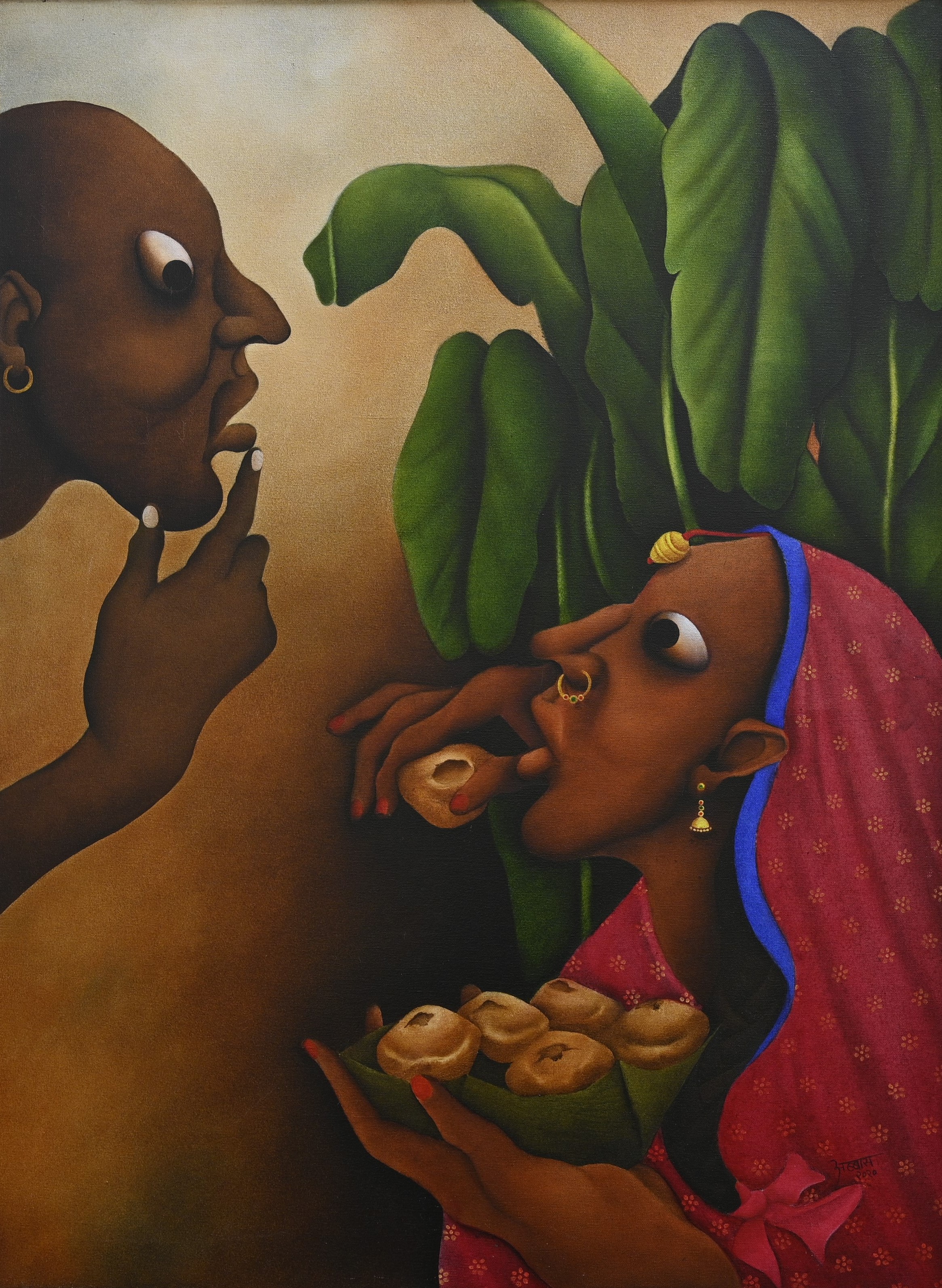 This painting by Abbas Batiwala portrays a satirical and expressive scene filled with exaggerated features and a playful yet sharp narrative quality. At the centre, a woman dressed in a red sari with a blue border and adorned with traditional jewellery is caught in the act of eating sweets, holding a leaf bowl filled with more. Her wide, bulging eyes and elongated face heighten the drama of the moment, while her slightly mischievous expression suggests secrecy or indulgence. Opposite her, a bald male figure with large, questioning eyes and a finger raised to his lips seems to confront or judge her actions, his expression oscillating between surprise, disapproval, and curiosity. The lush green banana leaves in the background add vibrancy, grounding the figures in a familiar domestic or festive setting. Through its bold forms, earthy palette, and caricature-like style, the painting captures humour, human impulses, and social commentary, turning a simple act of eating into a larger reflection on indulgence, scrutiny, and everyday theatrics.