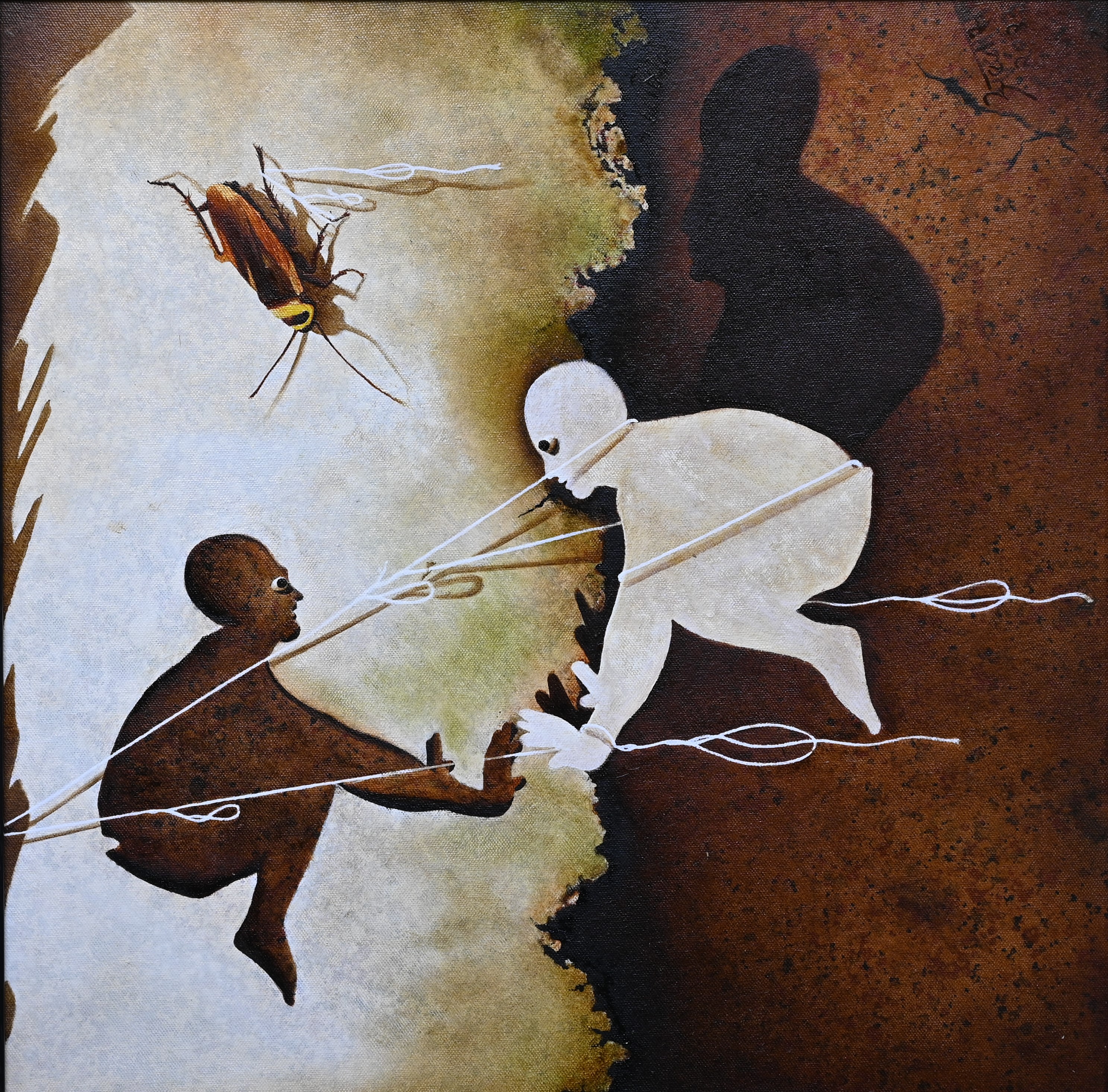 This painting by Abbas Batiwala presents a surreal and symbolic scene where two human figures, one dark brown and the other stark white, are bound together by thin rope-like lines that pull at their bodies and mouths, almost like puppets in tension. The dark figure sits suspended on the left, reaching outward, while the white figure crouches on the right, pulling in the opposite direction, their struggle accentuated by the jagged boundary between light and dark that divides the background. Above them, a large cockroach hovers, introducing a sense of unease and intrusion, while the white figure’s shadow looms darkly behind, reinforcing themes of duality and hidden conflict. Through this interplay of contrast, entanglement, and unsettling imagery, Batliwala creates a mood of struggle, domination, and imbalance, prompting reflections on power, control, and the fragile boundary between purity and decay.