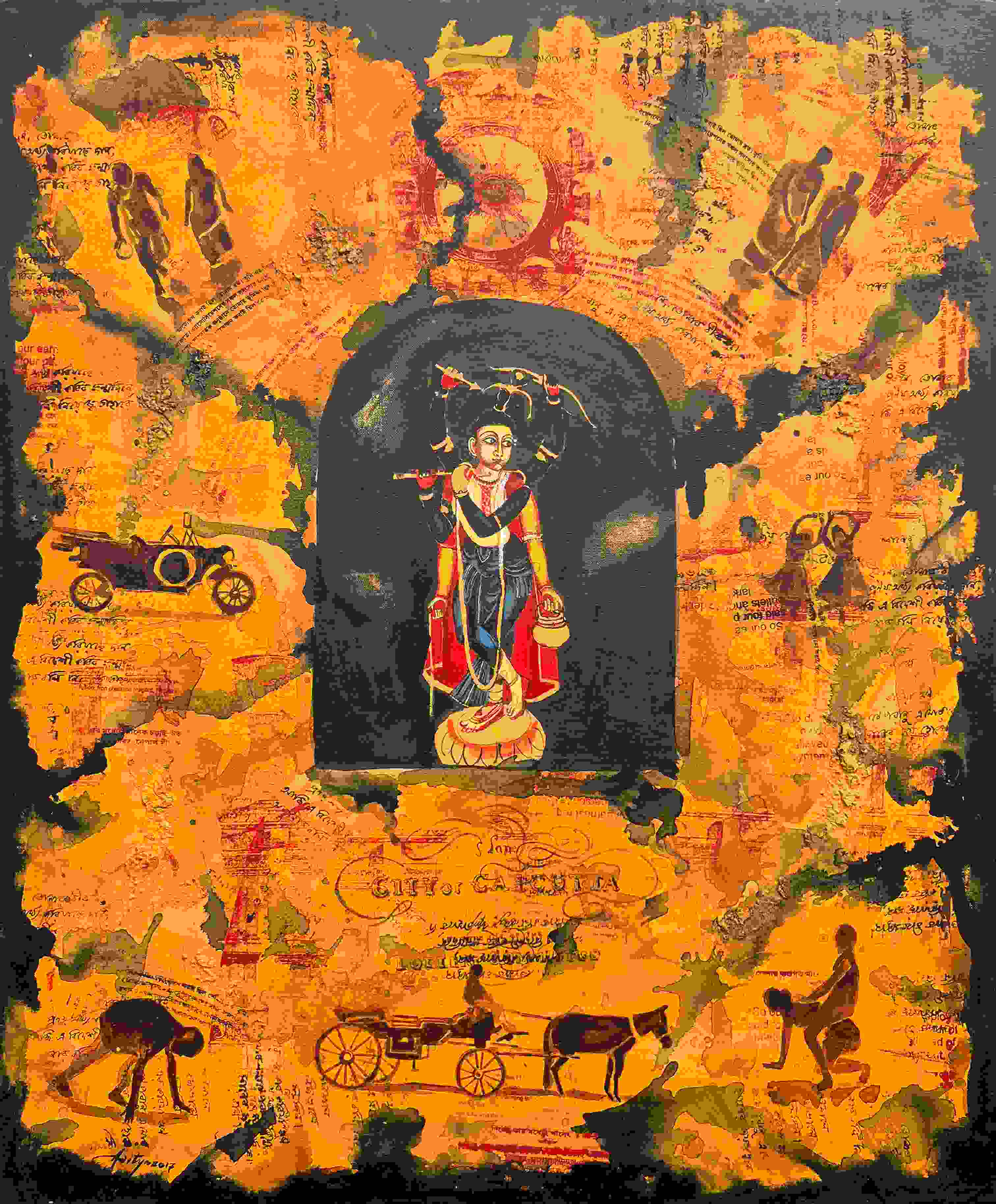 This painting by Aditya Basak blends traditional iconography with layered historical textures.