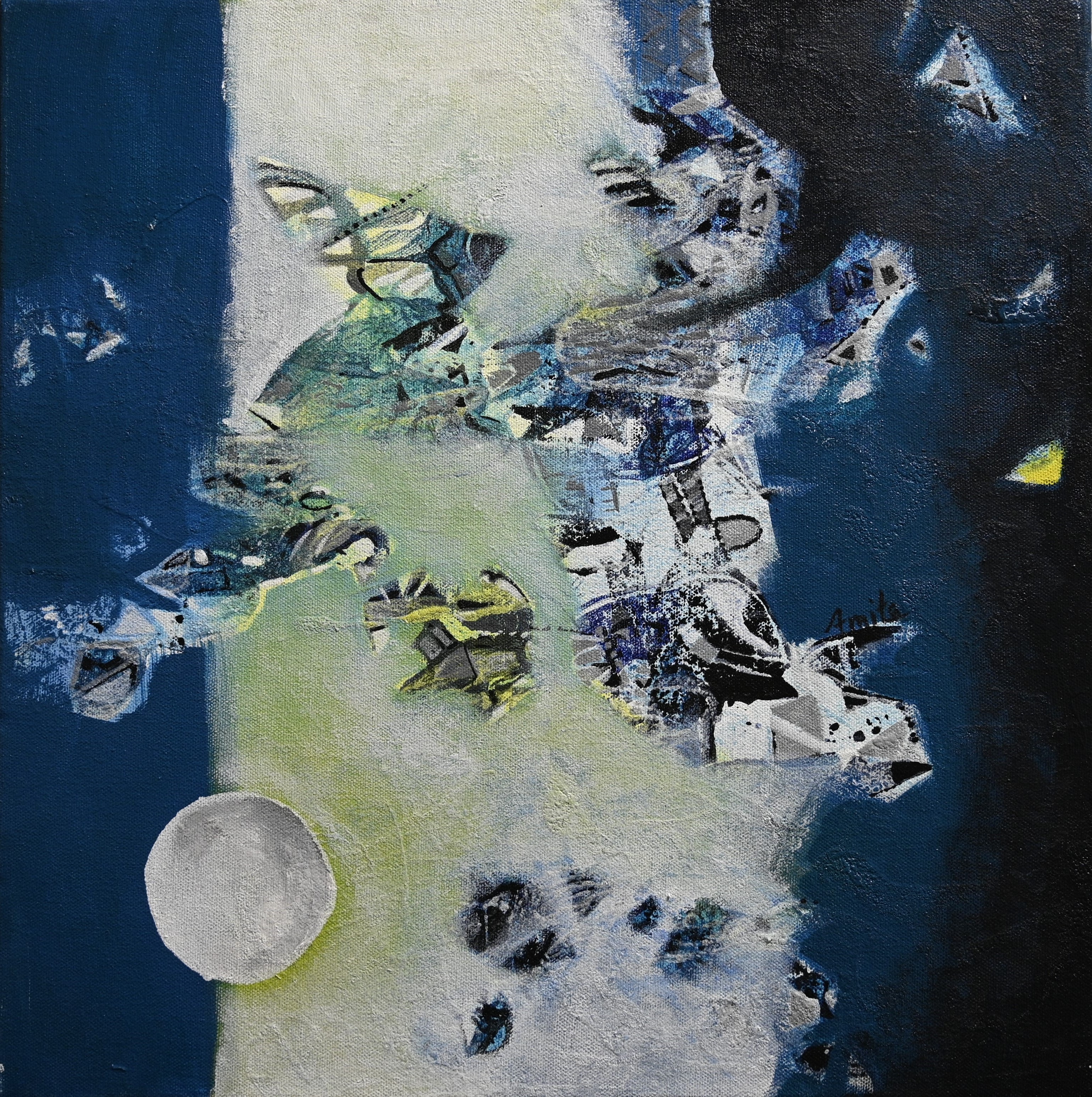 This painting by Amita Raj Goyal unfolds as an abstract dialogue between light and darkness, stability and motion. The canvas is vertically divided, with deep indigo and black on either side framing a luminous central passage of pale green and white, almost like a vertical beam of light. Within this radiant axis, fragmented geometric and organic forms appear to drift, collide, and scatter, suggesting both construction and dissolution.