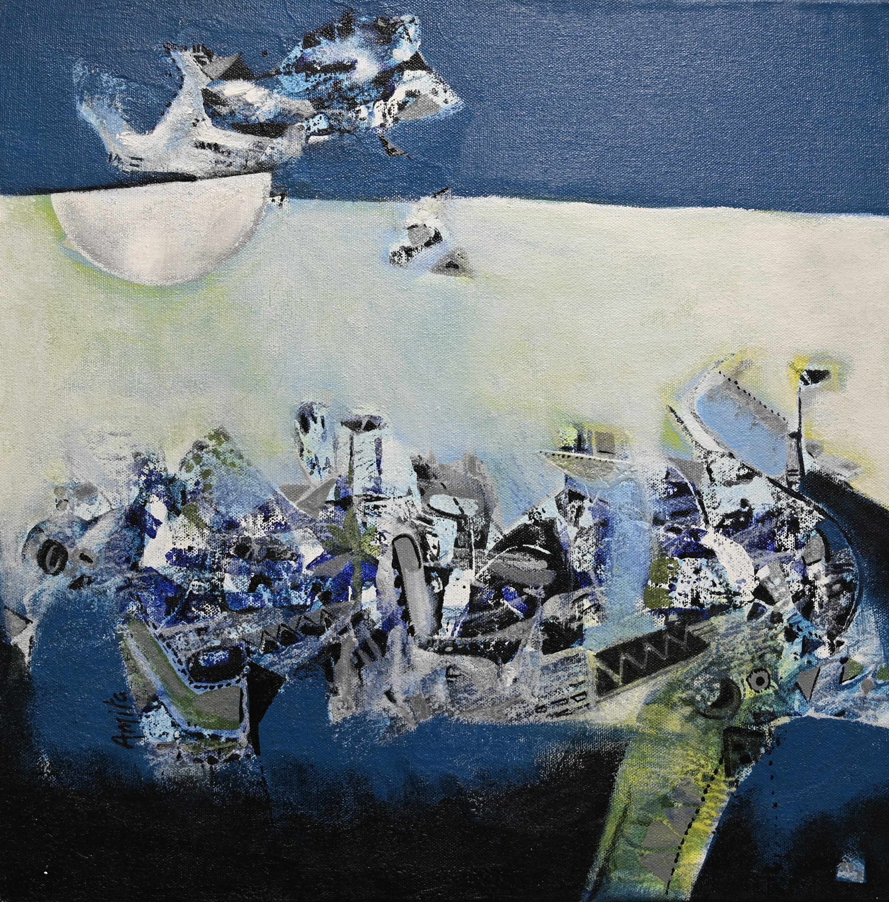 This painting by Amita Raj Goyal is a lyrical abstraction that evokes a dreamlike landscape through its use of layered textures and shifting tonalities. The canvas is divided into two broad bands: a deep blue sky above and a pale, almost glowing horizon below, where a half-disc form suggests the rising or setting moon. Emerging from this horizon is a cluster of fragmented, overlapping shapes—angular, curved, and textured—forming a dynamic interplay of black, white, blue, and muted green. These elements resemble both architectural remnants and organic fragments, blurring the line between nature and structure.