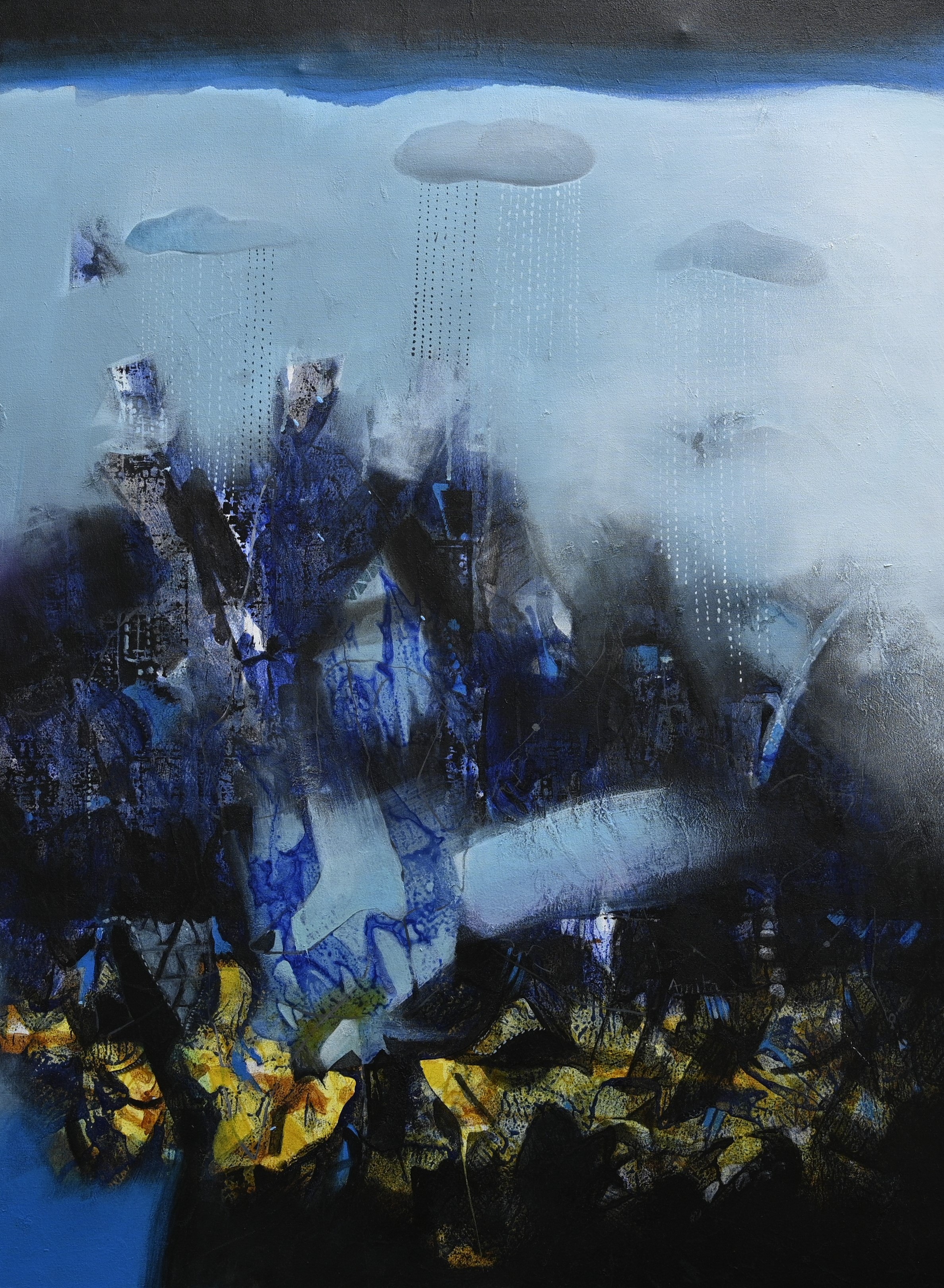 This painting by Amita Raj Goyal presents an evocative abstract composition that captures the atmospheric interplay of nature and emotion. Dominated by shades of blue, black, and grey, the work suggests a rain-soaked landscape were soft, cloud-like forms hover above, releasing fine dotted lines of rainfall. Below, a dense layering of deep indigo and black brushwork creates a textured terrain, evoking both turbulence and mystery, while luminous bursts of yellow at the base break through the darkness like fragments of light or earth’s resilience. The contrast between cool, misty tones and vibrant warmth gives the painting a meditative yet dynamic quality, inviting reflections on cycles of renewal, fragility, and transformation. Through abstraction and a poetic use of color, Goyal conveys the shifting moods of nature, balancing tension with hope, shadow with illumination.