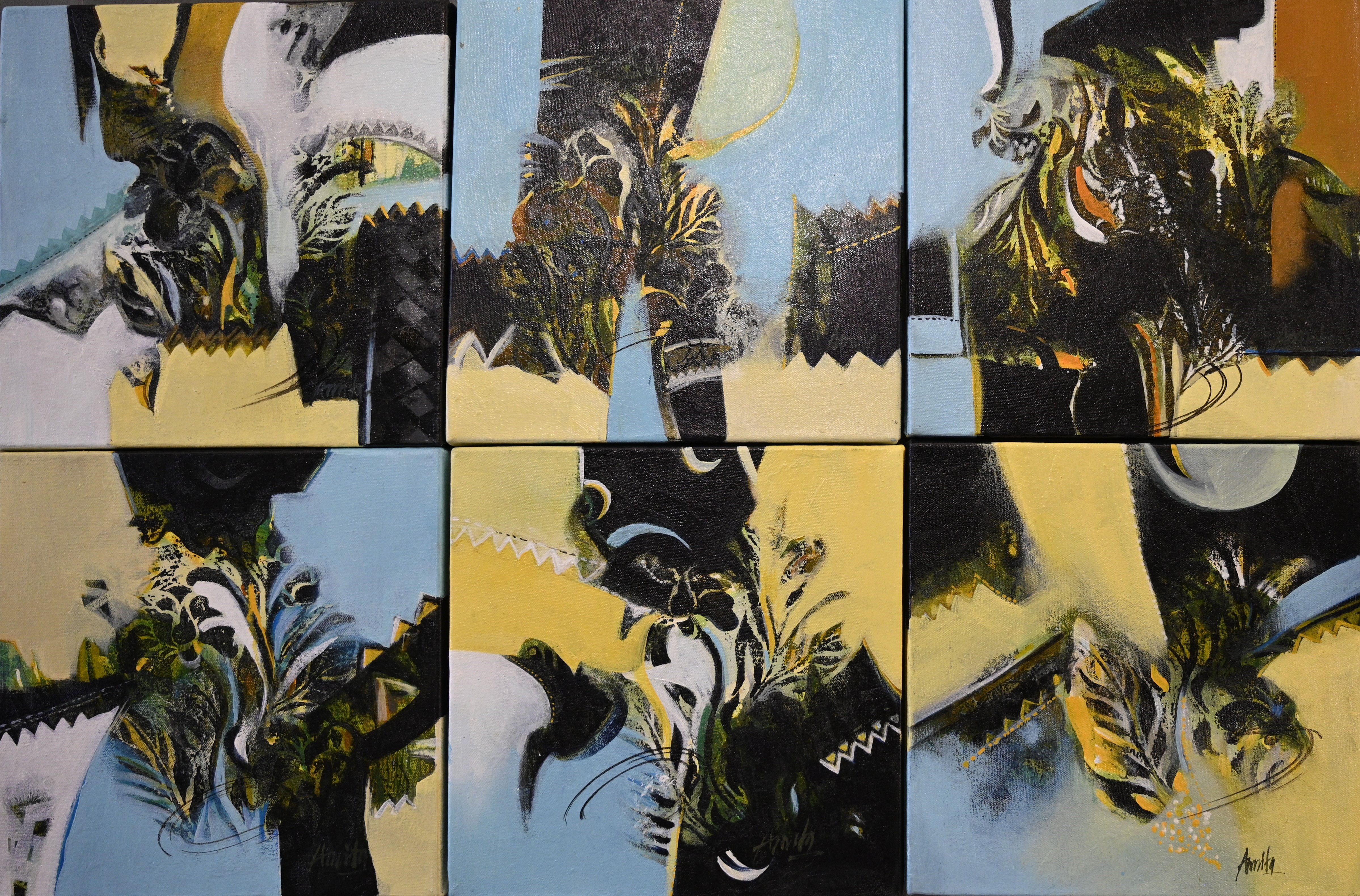 This painting by Amita Raj Goyal is a multi-panel work composed of six interconnected canvases, forming a rhythmic and dynamic abstract composition. The interplay of muted blues, soft yellows, and deep blacks creates a layered visual dialogue, while organic motifs resembling foliage, flowing lines, and fragmented forms emerge across the panels. Jagged zigzag edges and sharp contours cut through the softer areas, introducing a sense of tension within the otherwise fluid, organic shapes.