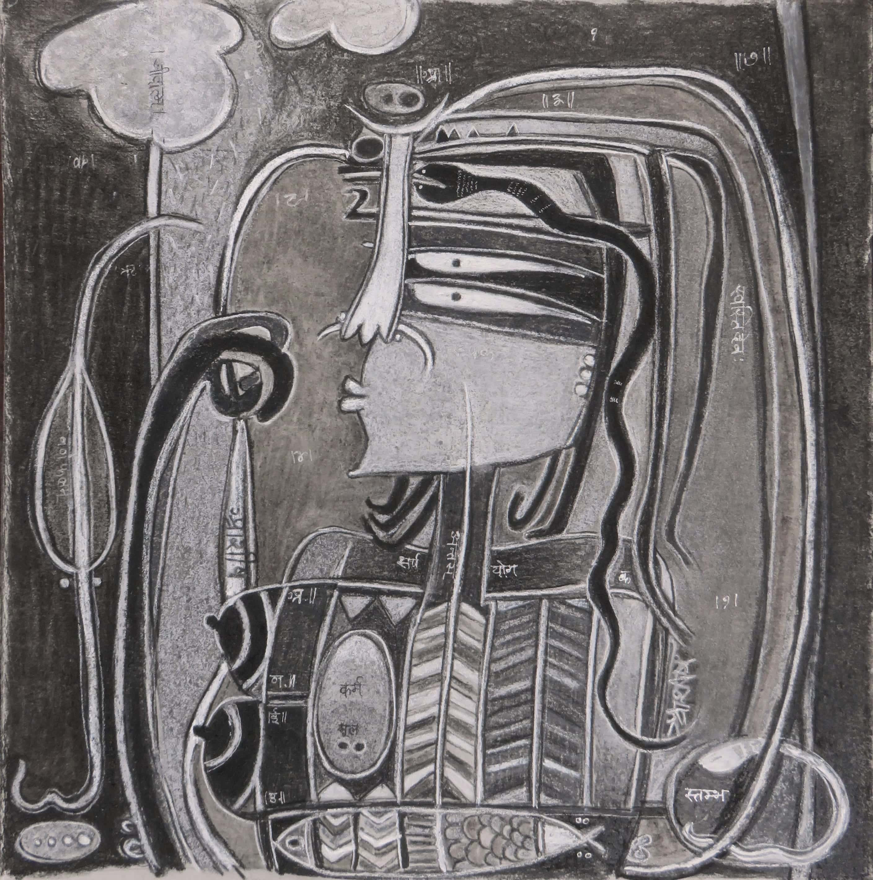 Rendered in black, grey, and white, the painting evokes the austerity of stone inscriptions or ancient cave drawings, yet it carries a modernist energy through its stylization and rhythm of line. The monochrome palette heightens the meditative, timeless quality, making the figure feel like both a deity and a diagram of cosmic principles.In contrast to the earlier colourful painting, which radiates sensual vitality and mythic exuberance, this one feels more introspective and analytical—almost like a coded philosophical text disguised as an artwork.