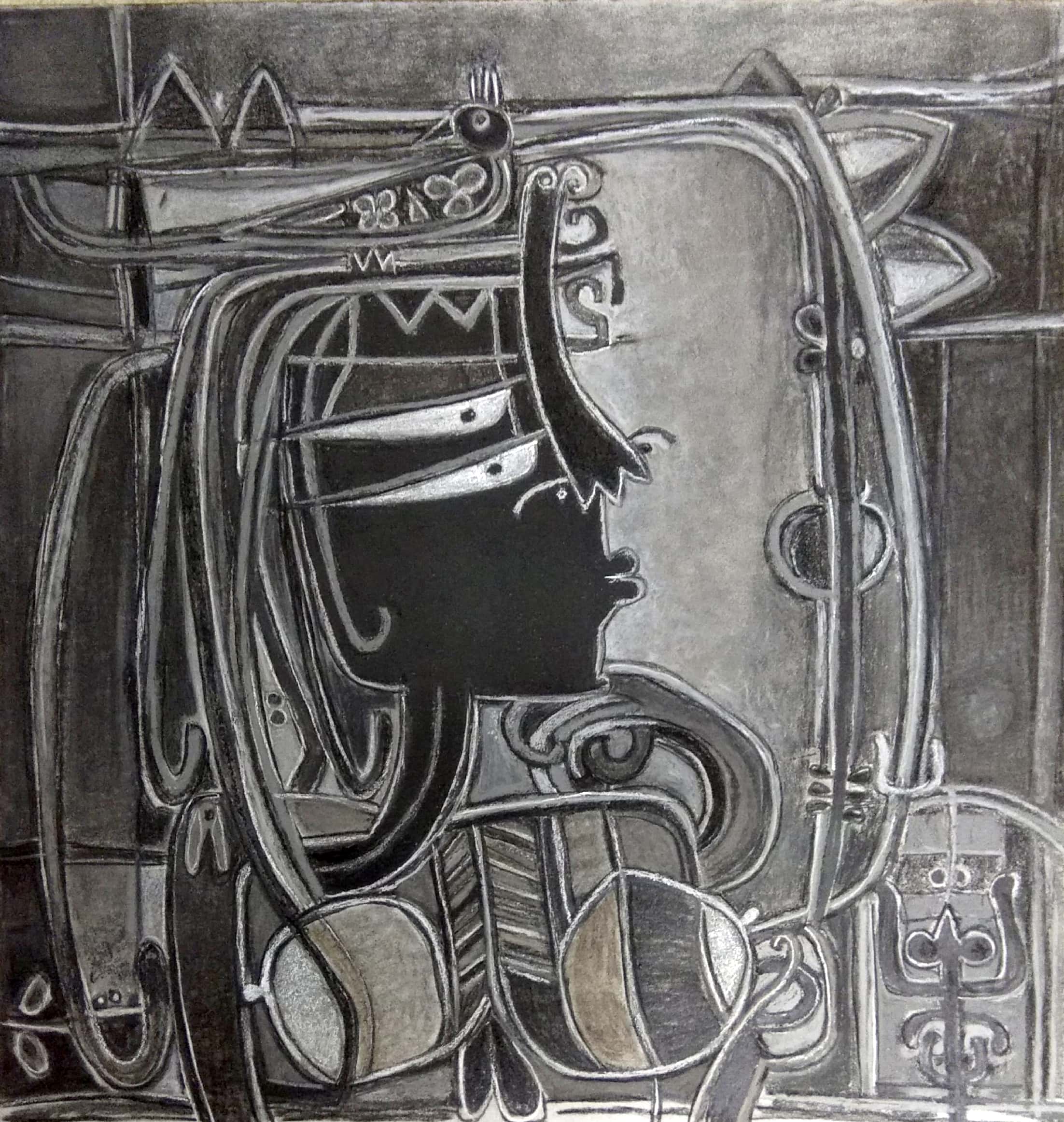 This monochromatic work carries a quiet but commanding presence, drawing the viewer into a world of symbolic figuration and ritual geometry. The central profile of a figure—rendered in stark black against gradients of grey and white—emerges like an icon carved in stone. The sharp contour of the face, adorned with ornamental motifs, recalls ancient reliefs, while the flowing linear forms around it resemble a headdress or crown interwoven with serpentine curves, birds, and floral emblems.