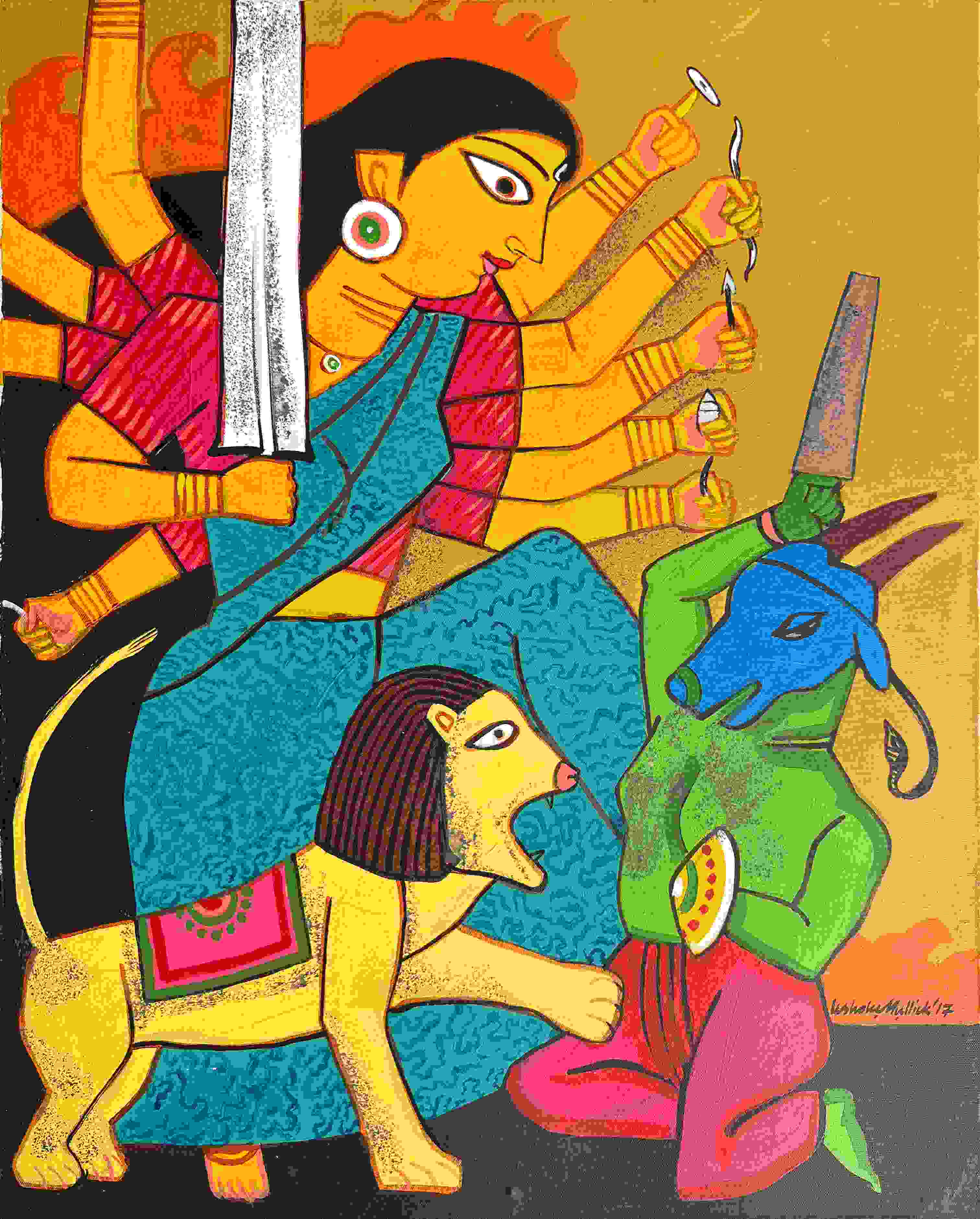 This vibrant painting by Ashoke Mullick depicts Goddess Durga in a bold, stylized form inspired by traditional Bengali folk art and Kalighat painting aesthetics.