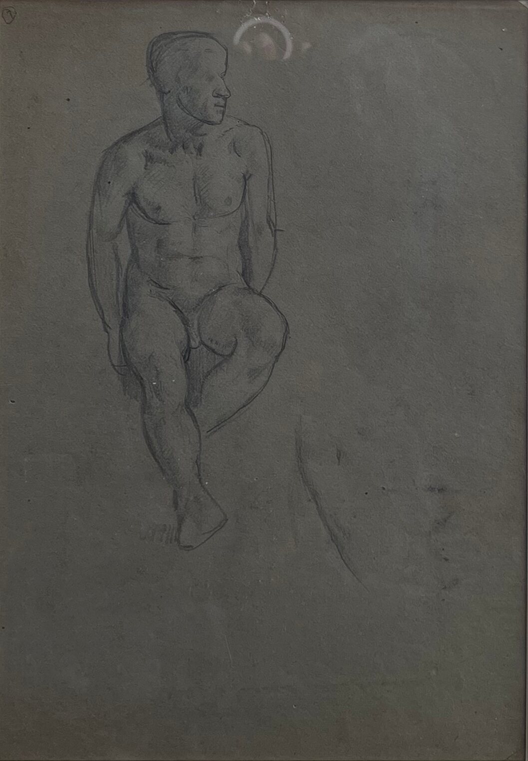 This life study by Atul Bose depicts a seated male nude, drawn with fine pencil lines on dark-toned paper.