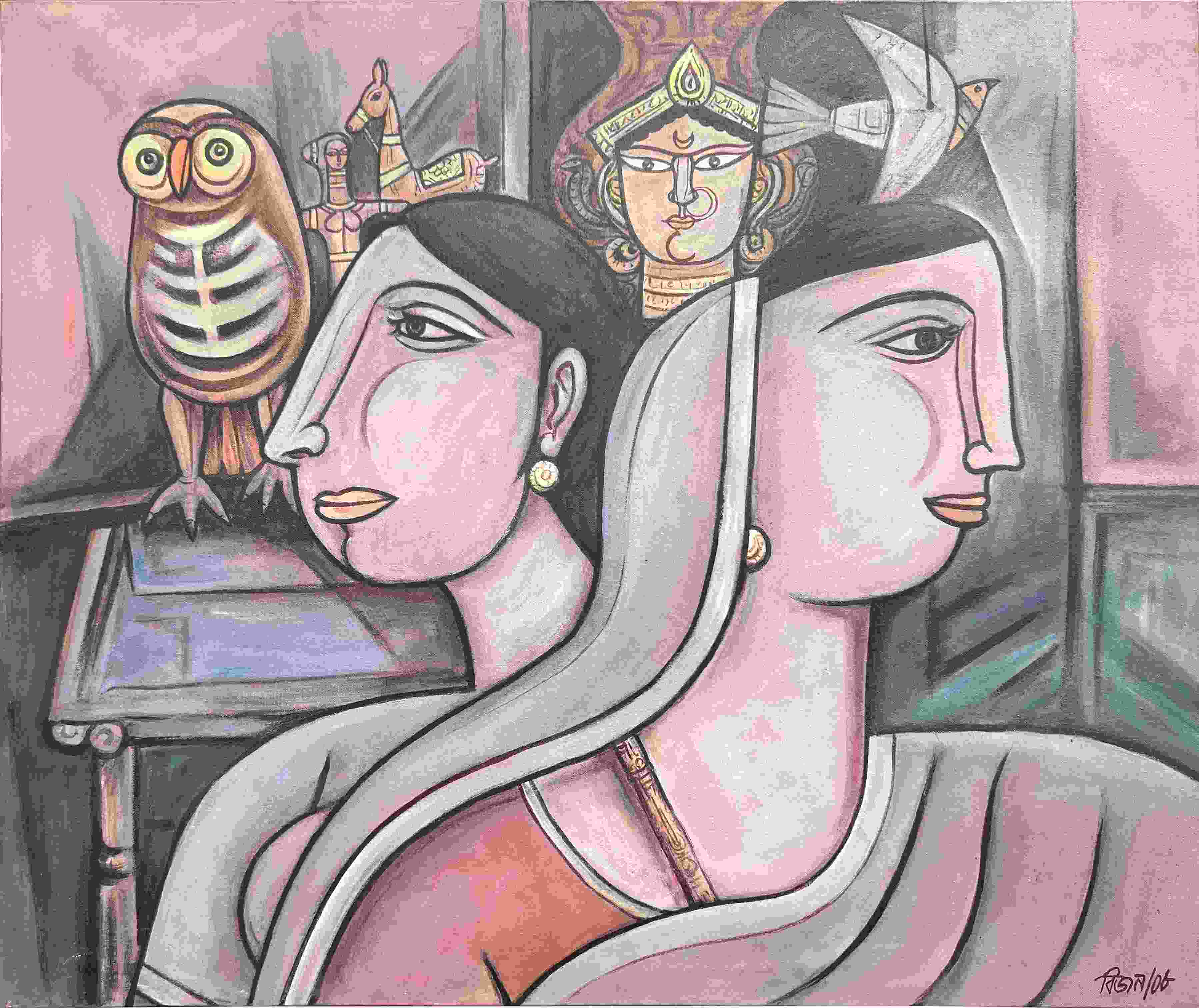 A painting, likely acrylic or oil on canvas, presents a composite scene of two women's faces in profile view, rendered in a style suggestive of Indian folk art. One woman's face is positioned slightly angled towards the viewer, with rich purple-grey tones and subtle shading creating depth. The other face, positioned further back, is also presented in profile, appearing subtly layered behind elements of the goddess Durga, recognizable by her ornate headdress. A large stylized owl with a bone-like pattern on its wings is positioned prominently in front of the woman's face to the far left.