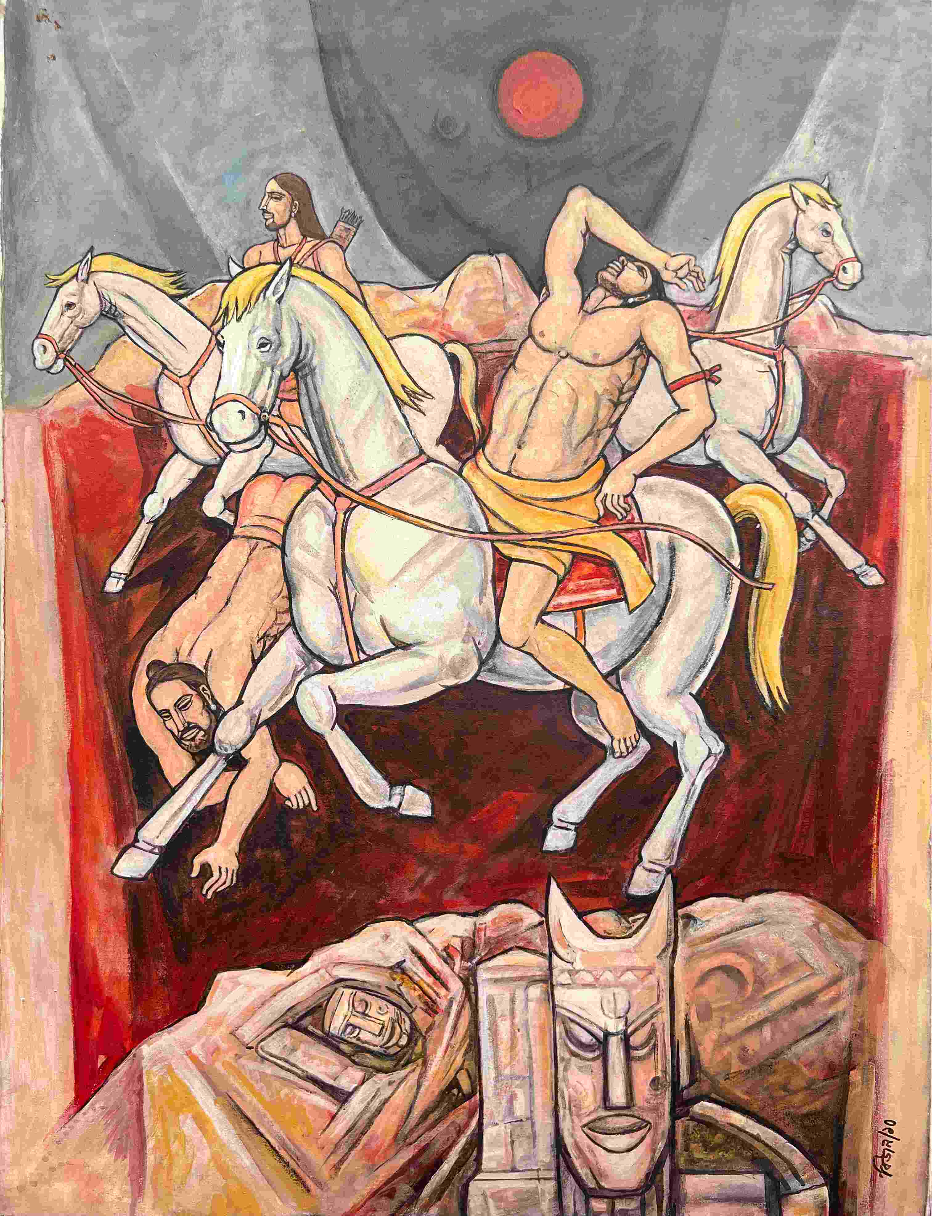 The white horses stand out vividly against a dramatic backdrop of grey-blue and dark red tones, dominated by a bold red sun-like disc.
