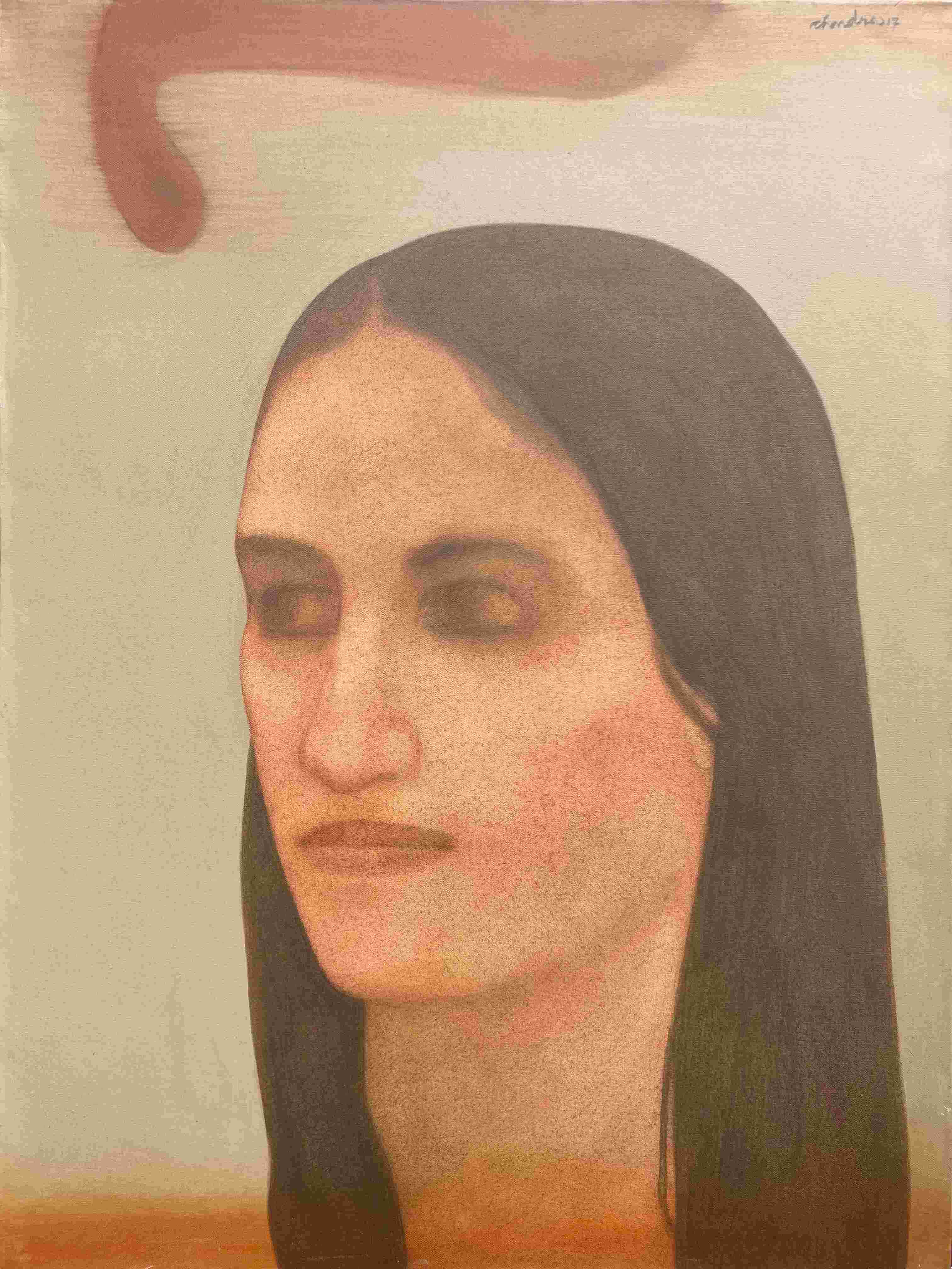 This portrait by Chandra Bhattacharjee depicts a woman from the mid-chest up, her head and shoulders dominating the canvas.
