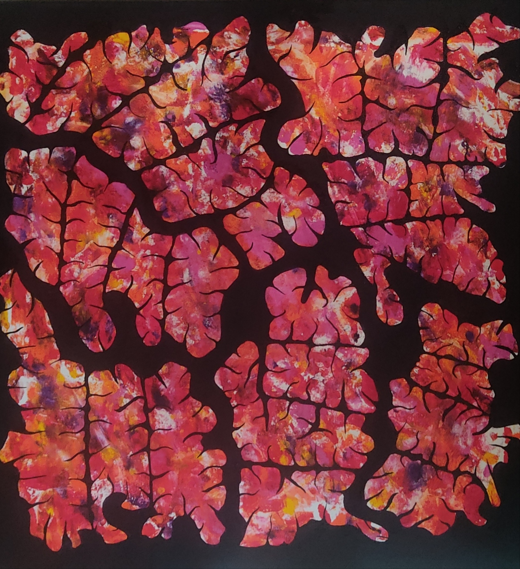 This artwork unfolds as a dynamic mosaic of organic leaf-like shapes that pulse with warmth and vitality. The bold silhouettes, set against a deep black background, create a striking contrast that enhances the vibrancy of the colours within each form. Shades of crimson, magenta, and fiery orange intermingle with splashes of purple and traces of white, generating a sense of movement and layered texture. Each shape seems to breathe individually yet remains part of a collective rhythm, evoking both natural growth and abstract patterning. The overall effect is one of exuberance and energy, where fragmentation transforms into harmony, inviting the viewer to see both the individuality of the forms and their interconnectedness.