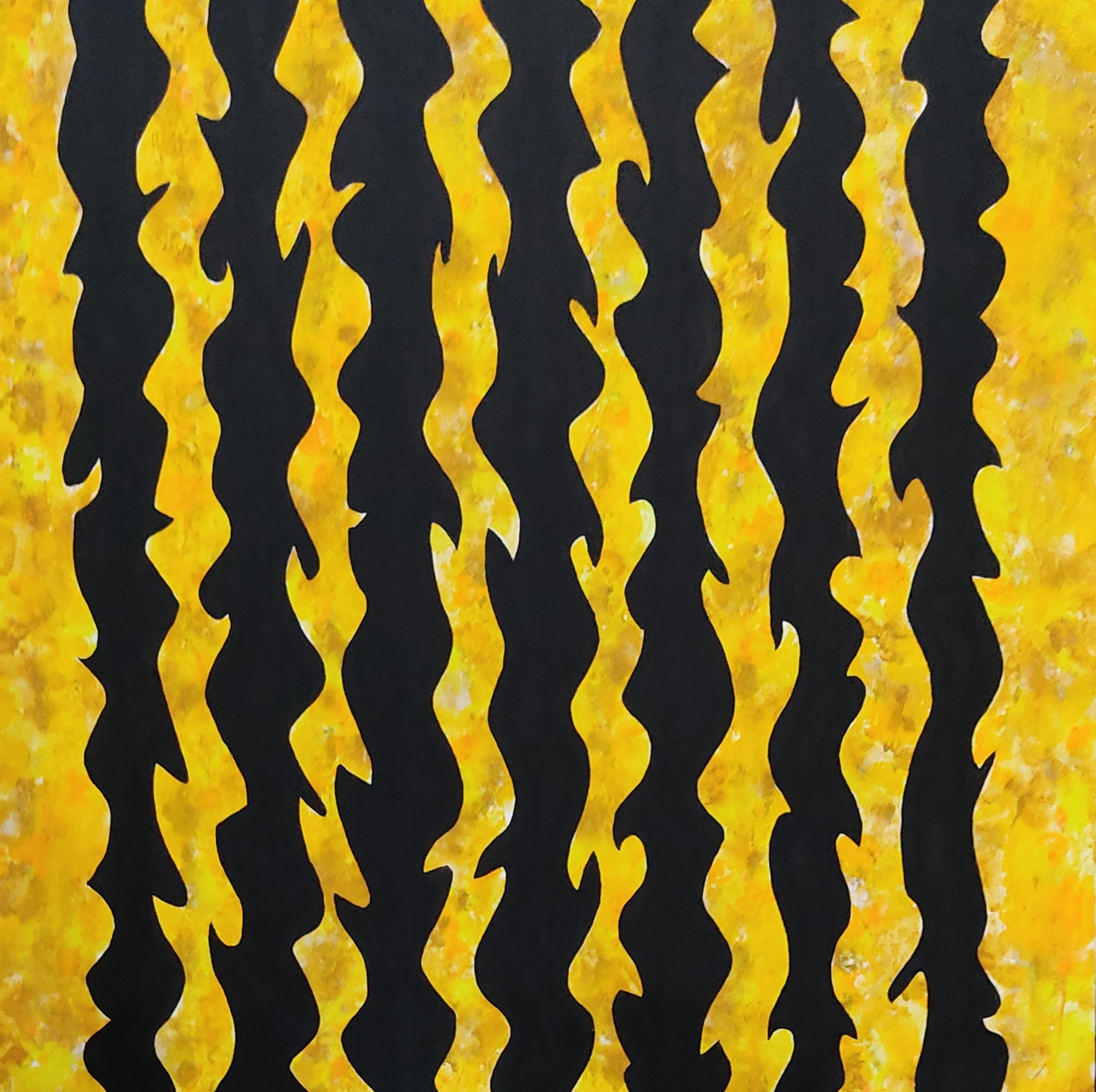 This painting carries a bold, almost primal energy through its interplay of form and color. Vertical, flame-like shapes ripple down the surface in a steady rhythm, alternating between dense black silhouettes and a luminous ground of yellows, oranges, and flecks of lighter hues. The yellow field is textured and mottled, evoking heat, light, and vibration, while the black forms slice through it with commanding presence.