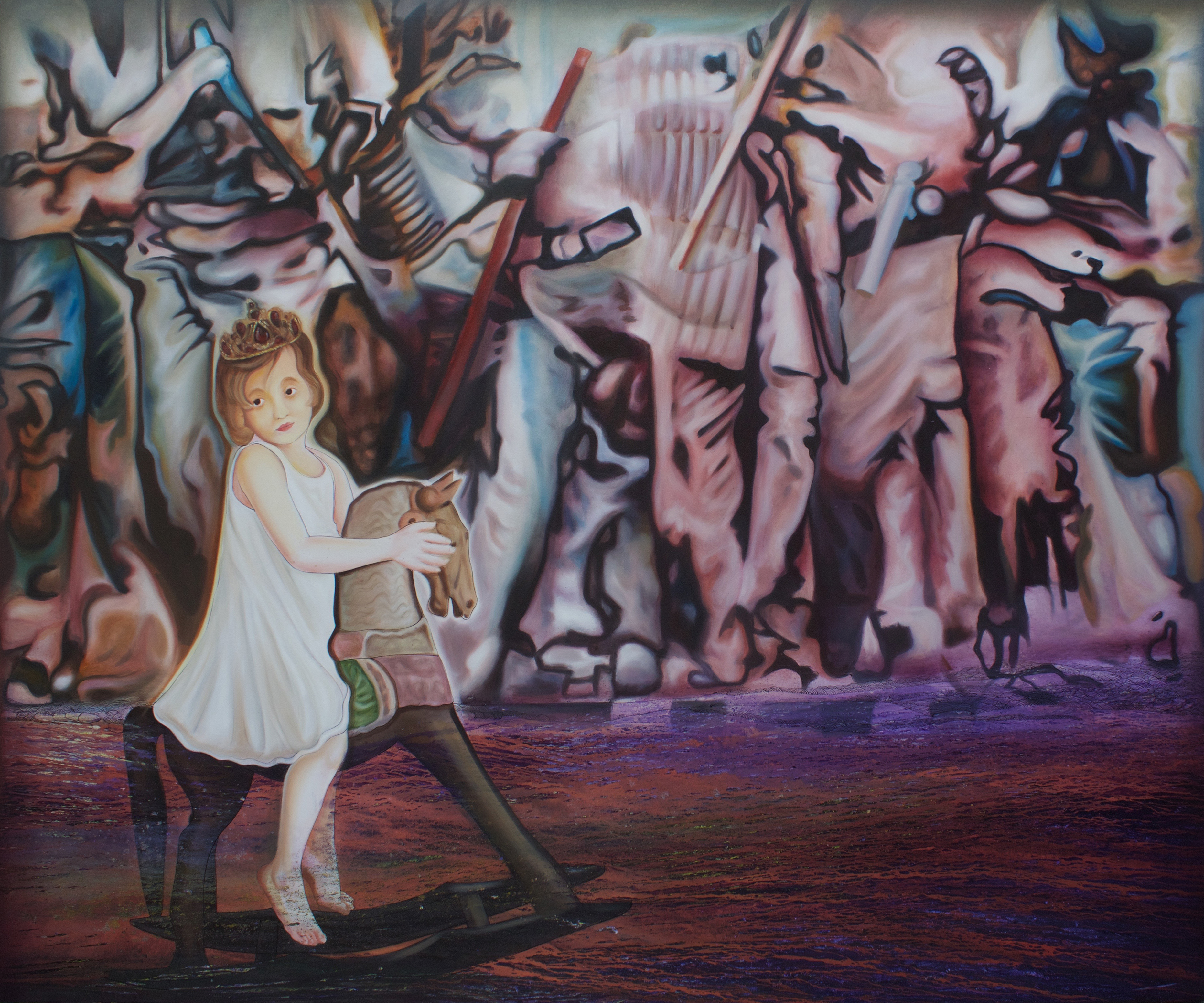 This painting presents a haunting juxtaposition of innocence and turmoil. In the foreground, a young girl in a delicate white dress and crown rides a wooden rocking horse, her gentle face turned toward the viewer with a mixture of vulnerability and quiet strength. The softness of her figure and attire contrasts starkly with the chaotic, almost nightmarish backdrop behind her. The background is filled with distorted, ghostly human-like figures in twisted postures, their forms merging into one another as if locked in perpetual conflict or anguish. Their jagged, skeletal outlines and deep shadows evoke a sense of violence and unrest, a stark counterpoint to the child’s fragile calmness.