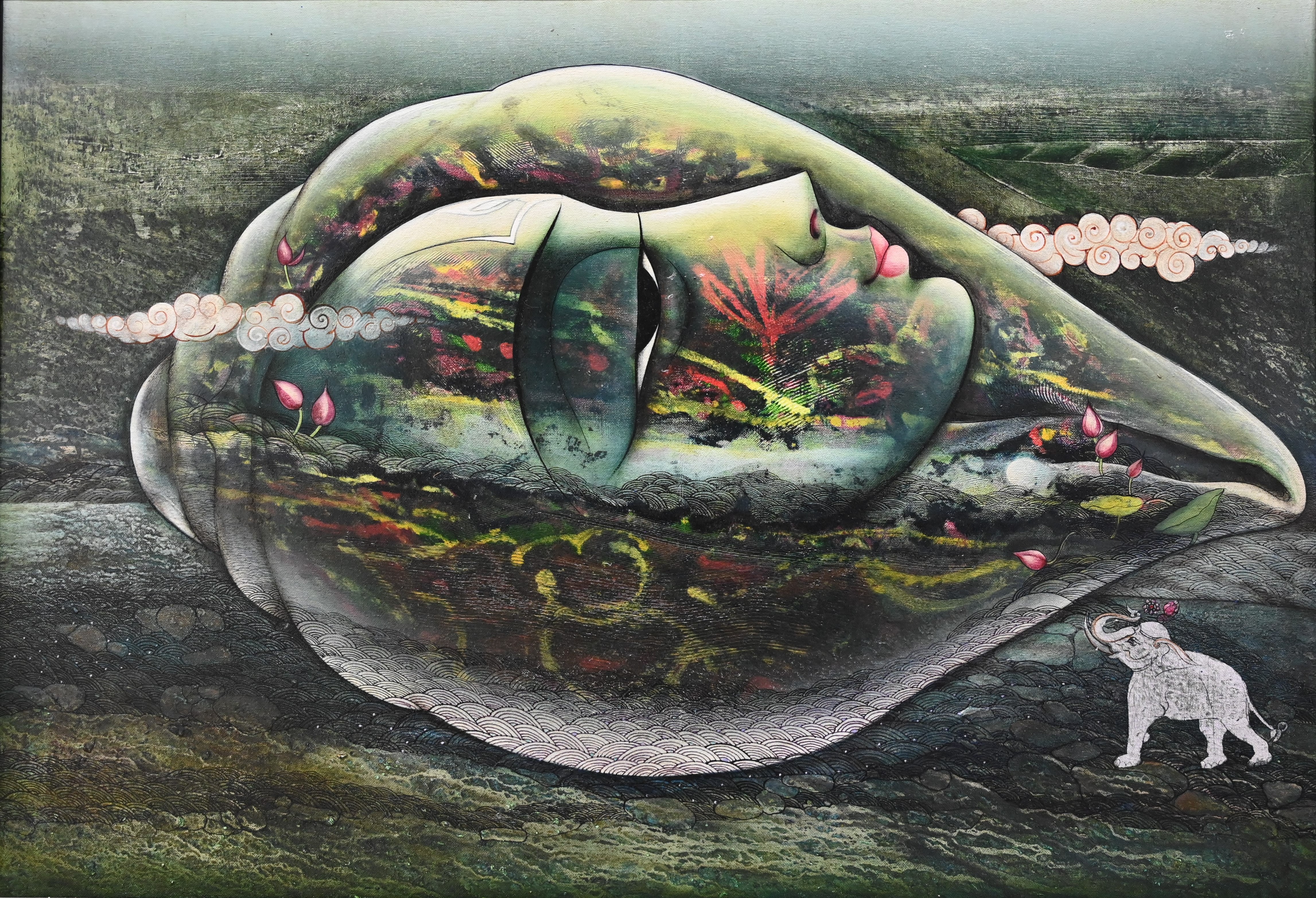 Lotus flowers sprout around and upon the form, representing purity, renewal, and enlightenment. At the bottom right, a small white elephant carries a lotus in its trunk, an auspicious figure associated with wisdom, power, and sacred symbolism in South Asian traditions. Its miniature scale compared to the reclining figure emphasizes humility and reverence before the divine or cosmic presence suggested by the sleeping form.