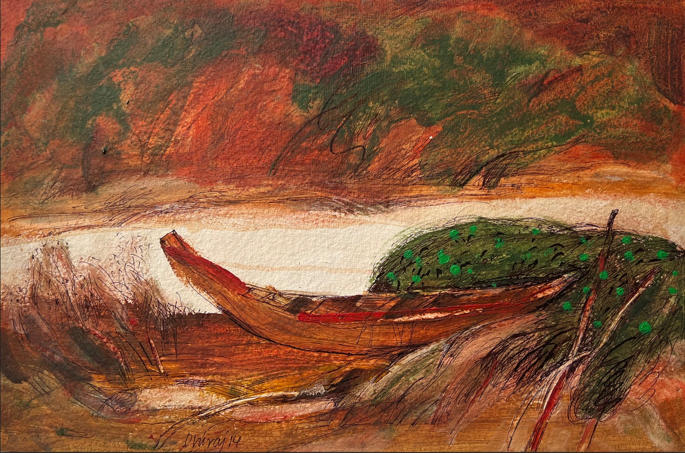 This painting by Dhiraj Choudhary captures the essence of rural India through a warm, textured palette of ochres, reds, and blues. At the center is a village woman clad in an orange sari, carrying a large earthen pot poised gracefully on her head, symbolizing her engagement in everyday household tasks.