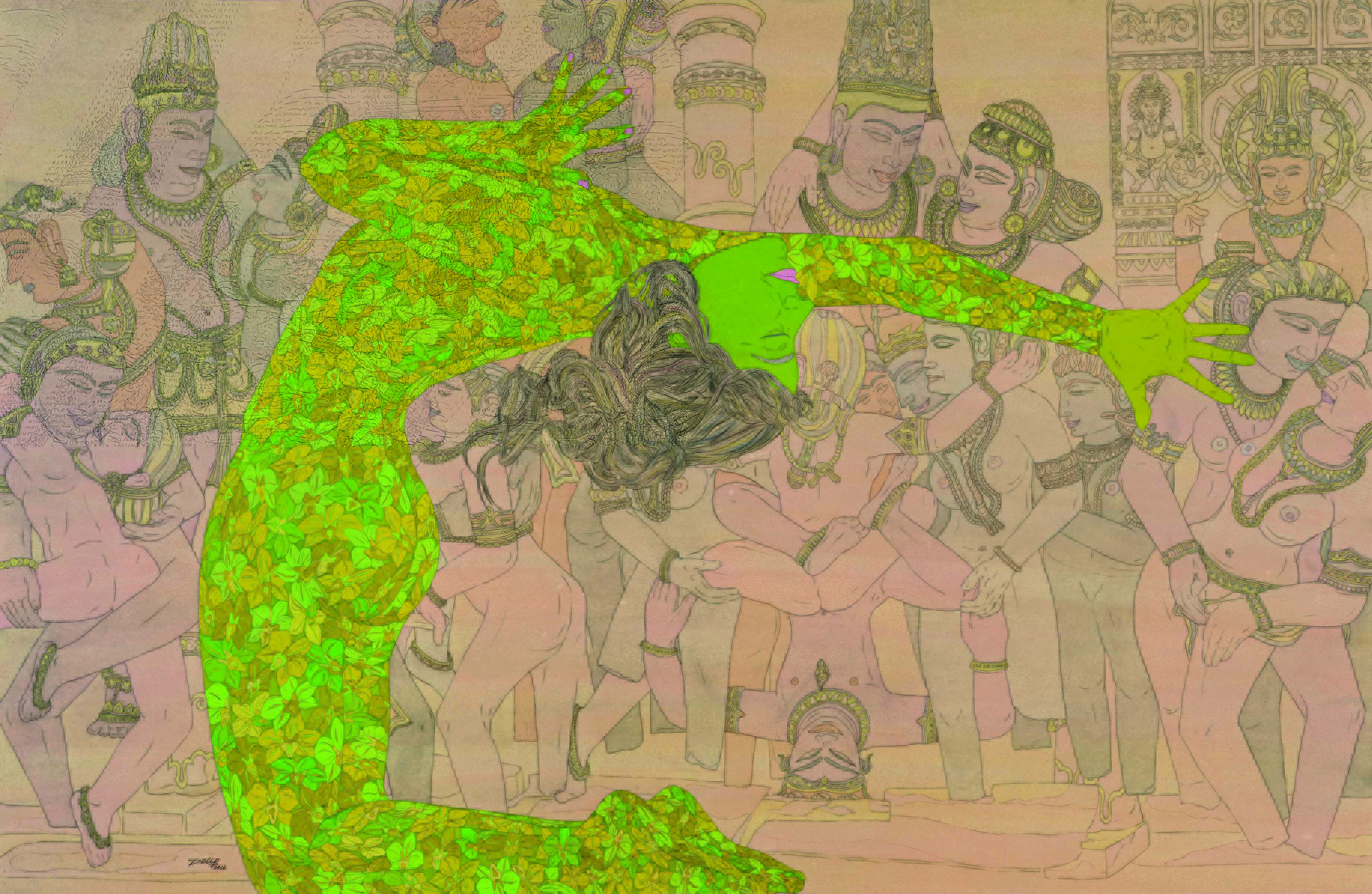 This watercolour painting radiates sensuality, mythology, and transformation. At its center, a female figure arches gracefully in a deep, almost yogic backbend, her body covered in lush green foliage with bright yellow blossoms, as though nature itself has fused with her skin. Her figure seems to merge the human and the organic, embodying growth, vitality, and the richness of nature. The flowing gesture of her hair enhances the fluid rhythm of her stance, amplifying the impression of motion and upliftment. Behind her, the backdrop is filled with intricate line drawings of temple sculptures—erotic couples and divine figures inspired by classical Indian art traditions. These softly shaded, almost faded forms contrast with the vivid greenness of the central figure, suggesting a dialogue between past and present, stone and flesh, mythology and contemporary embodiment. The erotic carvings frame her presence, situating her as both a continuation of and a departure from ancient traditions.
