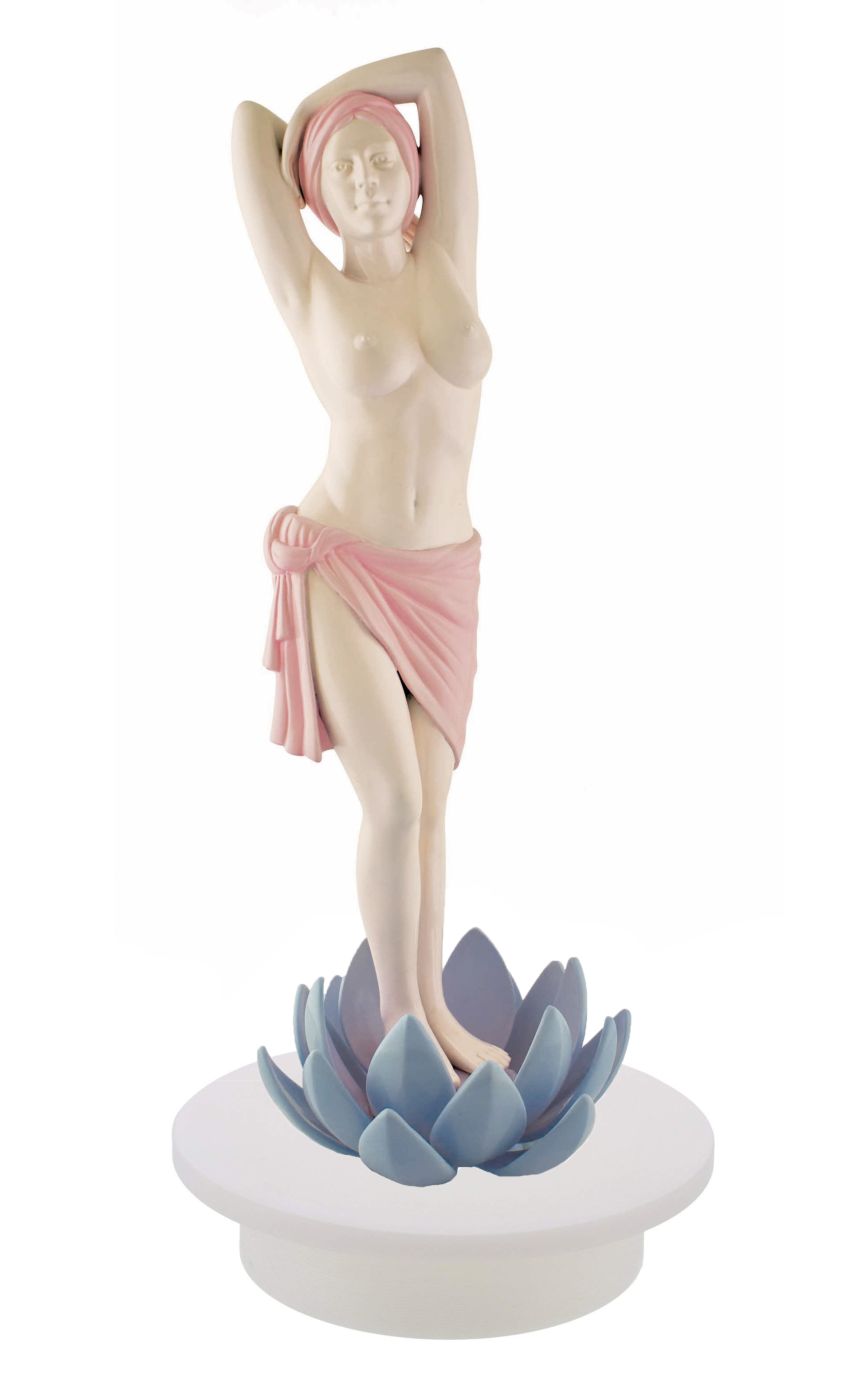 This fiberglass sculpture presents a serene yet sensual female figure rising gracefully from a stylized lotus base. Standing with one leg slightly bent, her body extends upward in a poised and elegant stretch, arms lifted above her head in a gesture of both relaxation and display. The figure is rendered in smooth, pale tones, her form idealized and softly luminous, recalling classical sculpture but infused with contemporary stylization.