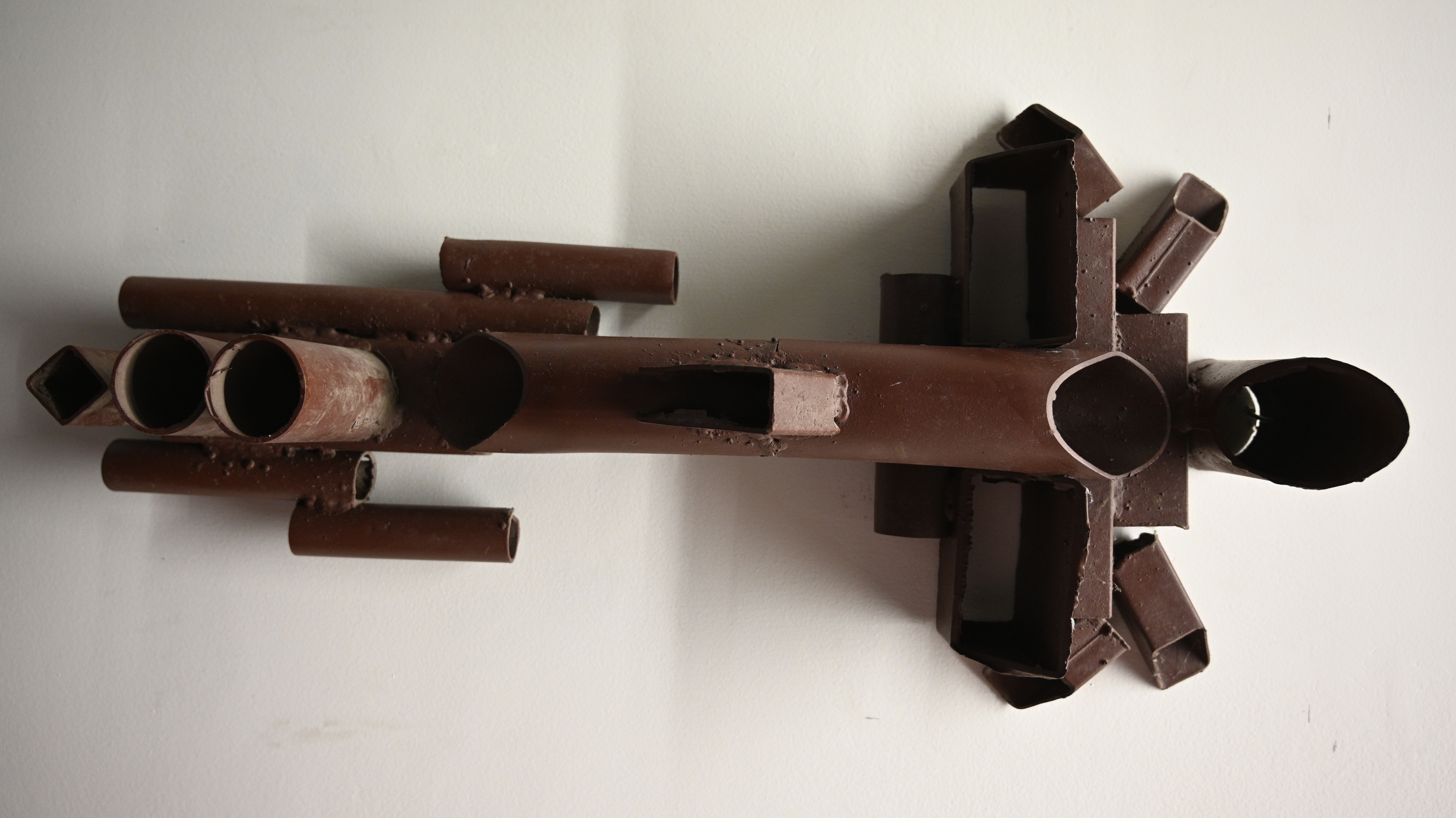 This sculpture continues the artist’s dialogue with mask and totem forms, but here the structure becomes more elongated and linear, resembling both a face and a vertical body. Cylindrical pipes dominate the form, with a long central tube acting as the nose or spine, while rectangular and circular cutouts extend outward like ears, arms, or wings. The lower section multiplies into smaller pipes, evoking a mouth filled with sound, or the layered rhythms of a musical instrument.