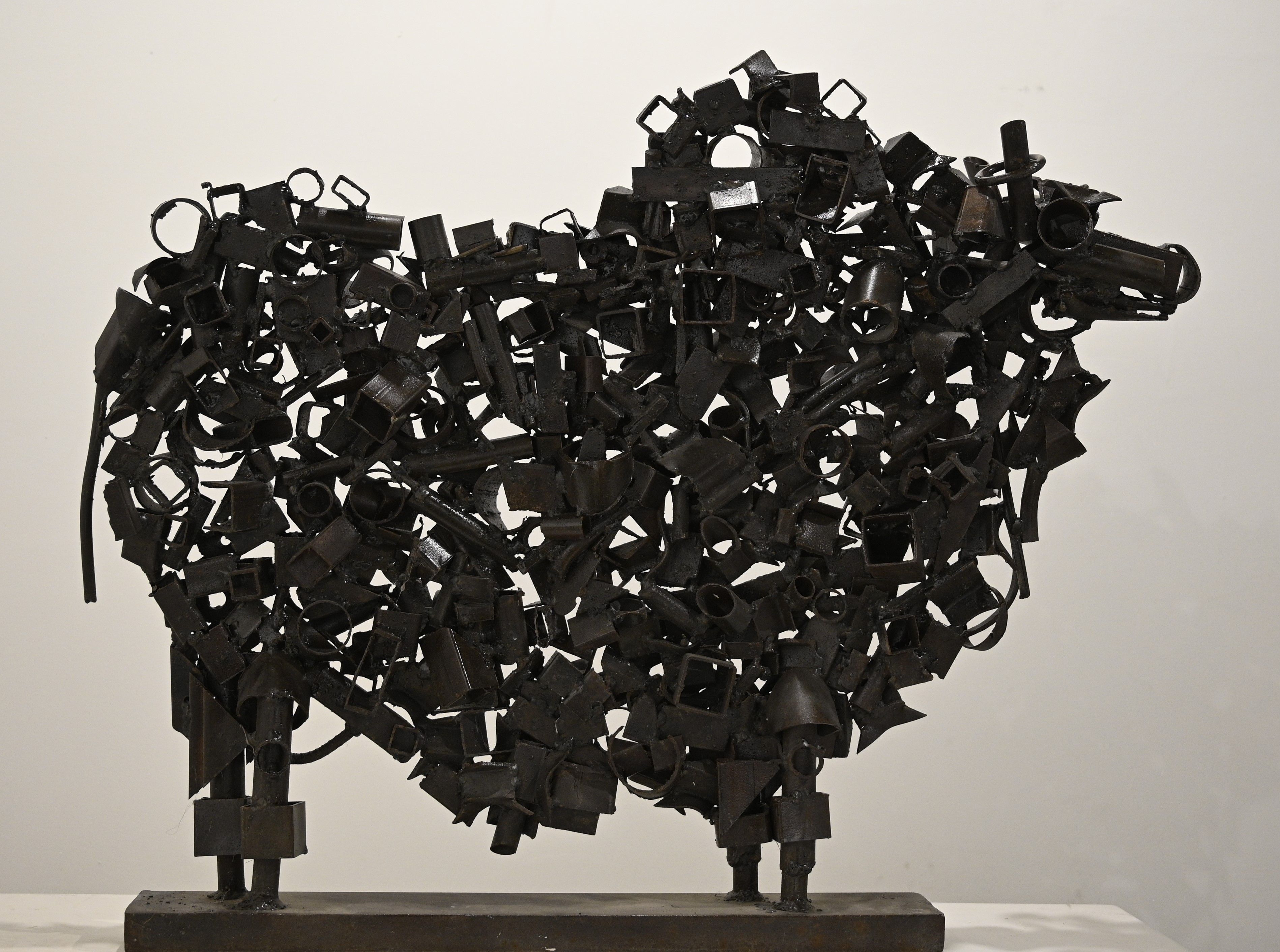 This sculpture portrays a sheep assembled from welded scrap metal components—nuts, bolts, rods, pipes, and other industrial debris. By reshaping these discarded, functional materials into a familiar organic form, the artist creates a figure whose densely layered metallic fragments mimic the woolly surface of the animal.