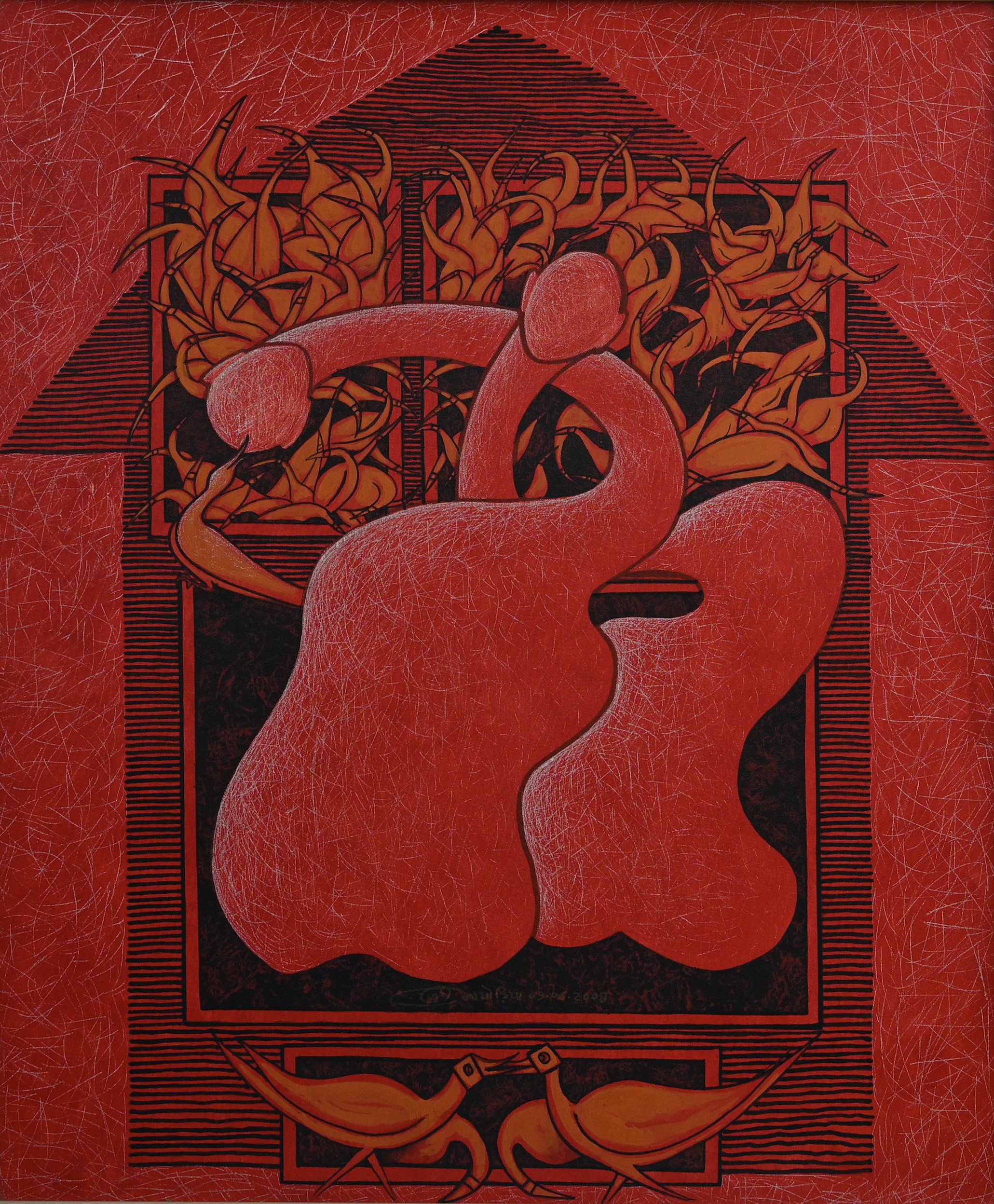 This artwork is dominated by a fiery red palette, where abstract human-like forms take centre stage in a rhythmic, dance-like motion. Two faceless figures, rendered with rounded and flowing contours, are entangled in an embrace that suggests both intimacy and intensity. Behind them, a backdrop of swirling orange shapes, reminiscent of flames or organic foliage, rises upward, reinforcing the sensation of burning energy and passion. The entire composition is framed within bold geometric outlines, giving structure to the otherwise fluid forms. At the base of the frame, two stylized birds face each other with sharp beaks, their posture suggesting dialogue, conflict, or harmony. The textured surface of the painting, marked with fine crack-like lines, adds depth and a sense of tension, as though the image itself carries the weight of human emotion. Overall, the painting merges abstraction and symbolism, evoking themes of passion, struggle, union, and the duality of relationships.