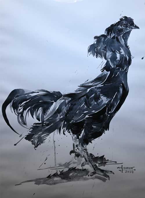 This artwork is a striking ink or watercolour painting of a rooster, executed with bold, fluid brushstrokes that merge spontaneity with controlled precision.