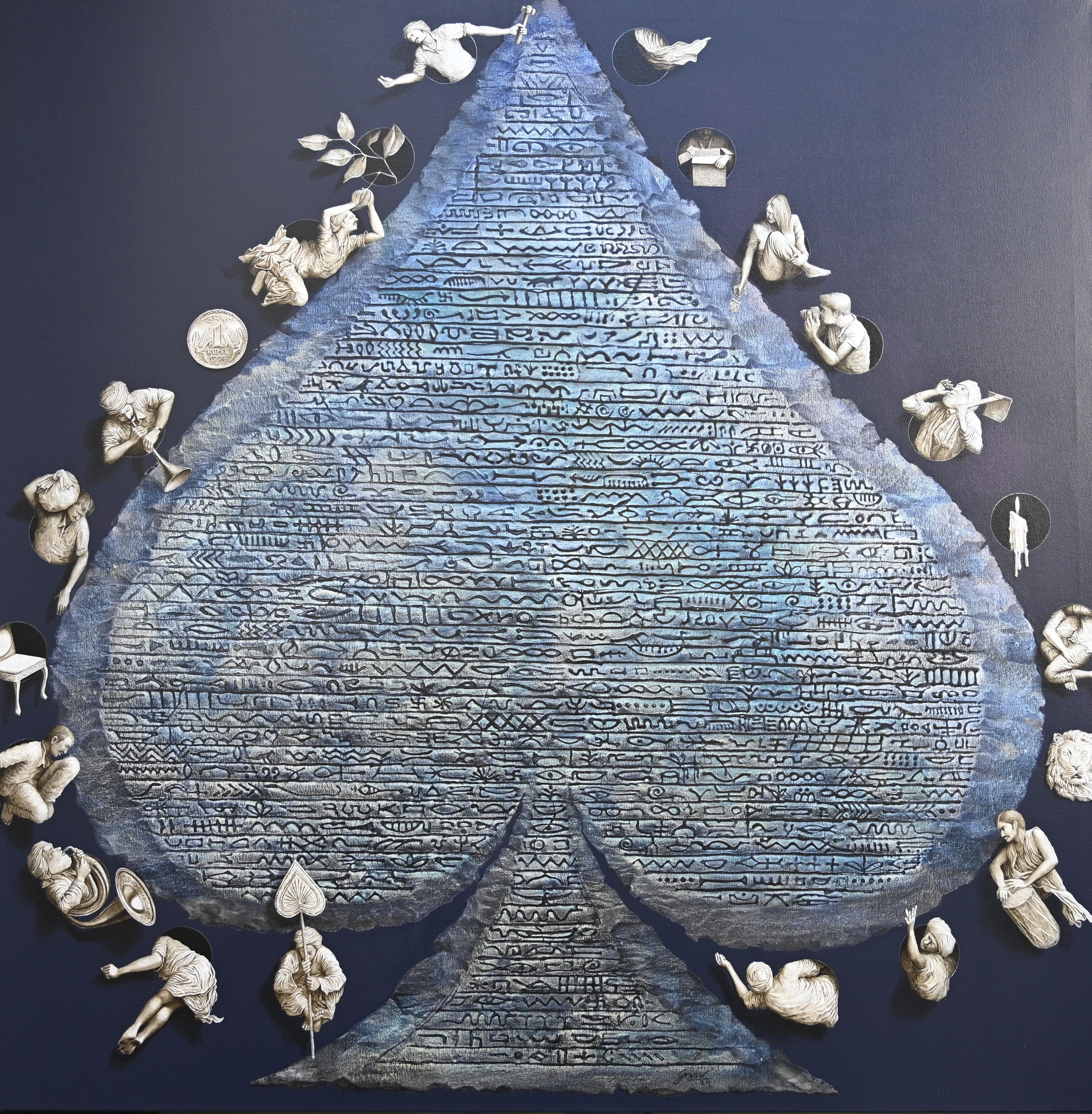 Visually, the contrast is striking: the monumental flat inscriptional surface of the spade (blue, textured, silent) is set against the lively, tangible, and almost theatrical actions of the small white figures. This tension reflects the dialogue between the immensity of time/history (the coded spade) and the fleetingness of individual human life (the figurines).