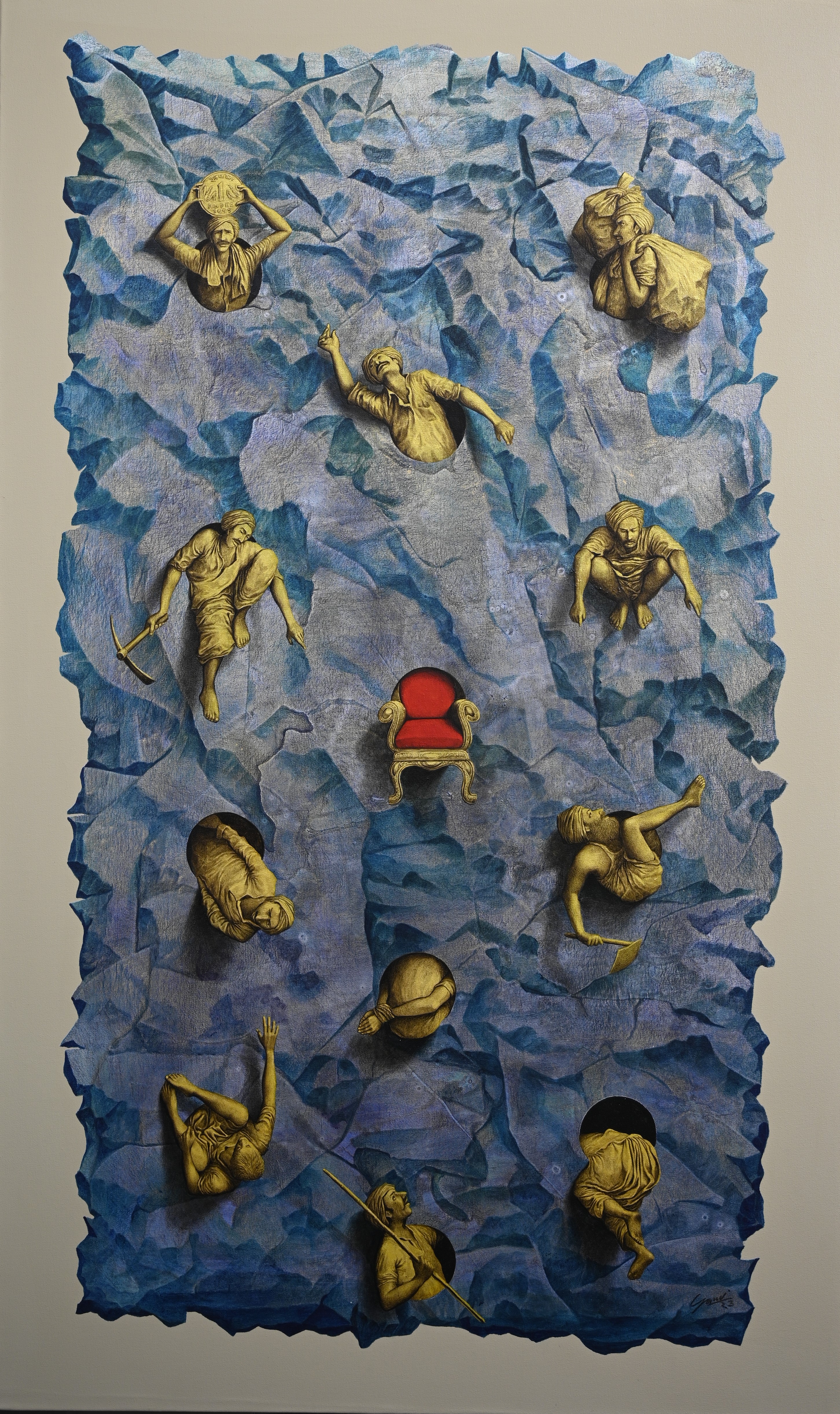 This artwork presents a striking vertical composition where figures in golden tones are scattered across a textured blue surface that resembles crumpled rock, torn paper, or a fractured wall. Each figure seems to emerge from or sink into these irregular voids, caught in gestures of labour, struggle, or contemplation. At the very centre of this turbulent field sits a red, ornate throne-like chair, glowing as a symbol of power, authority, or aspiration.