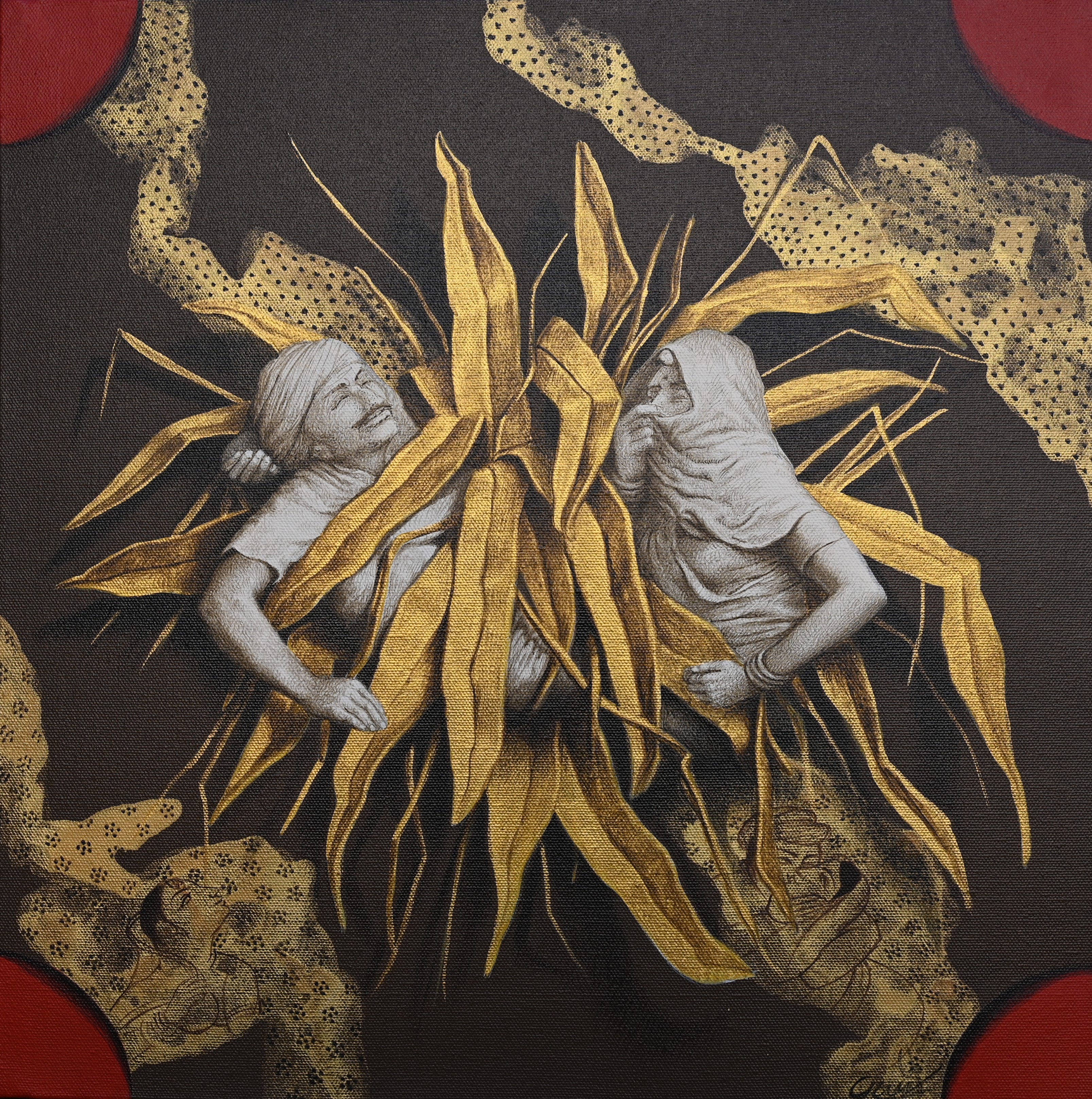 The golden foliage that envelops them can be read in multiple ways: as crops or harvest (suggesting fertility, sustenance, and rural labour), as entangling growth (pointing to struggle or confinement), or as a symbolic eruption of life force. Surrounding the central cluster, ghostlike outlines of other figures float in a patterned, fabric-like ground, blending into the texture. These faint presences seem like memories, ancestral spirits, or social echoes, reminding us that individual lives are always embedded within larger collective histories. The scattered red circles add a disruptive, almost cosmic punctuation — like suns, seeds, or wounds.
