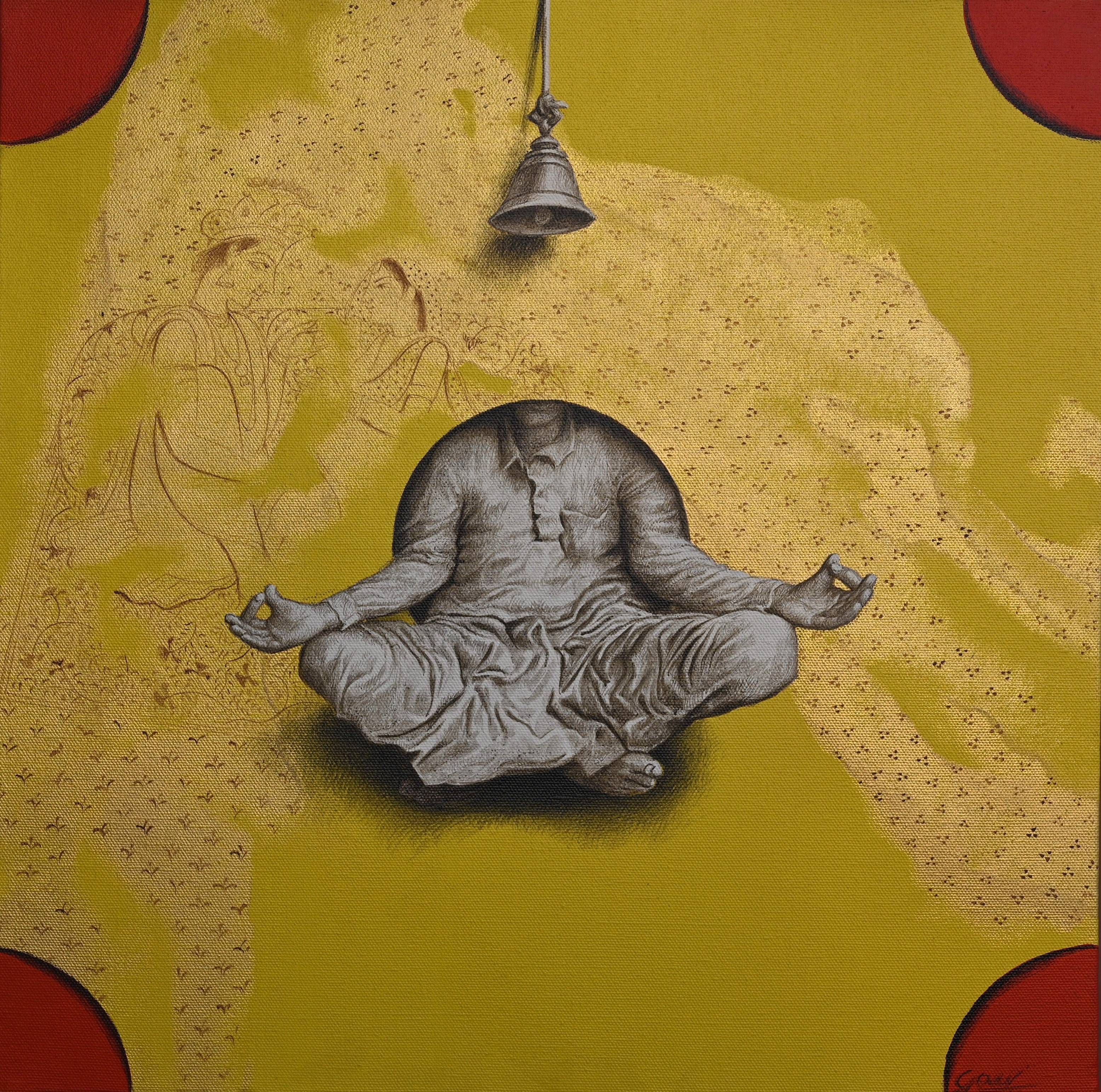 The background is a luminous yellow field, flecked with delicate patterns and faint outlines of mythological or courtly figures — drawn in the style of traditional miniature painting. These ghostlike presences seem to belong to another world: the past, mythology, or cultural memory. Meanwhile, the four red circular forms at the corners act almost like anchors or portals, balancing the composition and echoing cosmic or ritual symbols (suns, seeds, or wounds, depending on the context).The mood conveyed here is one of distance, quiet stillness, and a sense of being held in suspension. The absence of the head makes the figure simultaneously universal and anonymous: not an individual seeker but a stand-in for collective aspiration toward transcendence. The bell, waiting to be rung, hovers like an unanswered call — the thin line between ritual and emptiness.