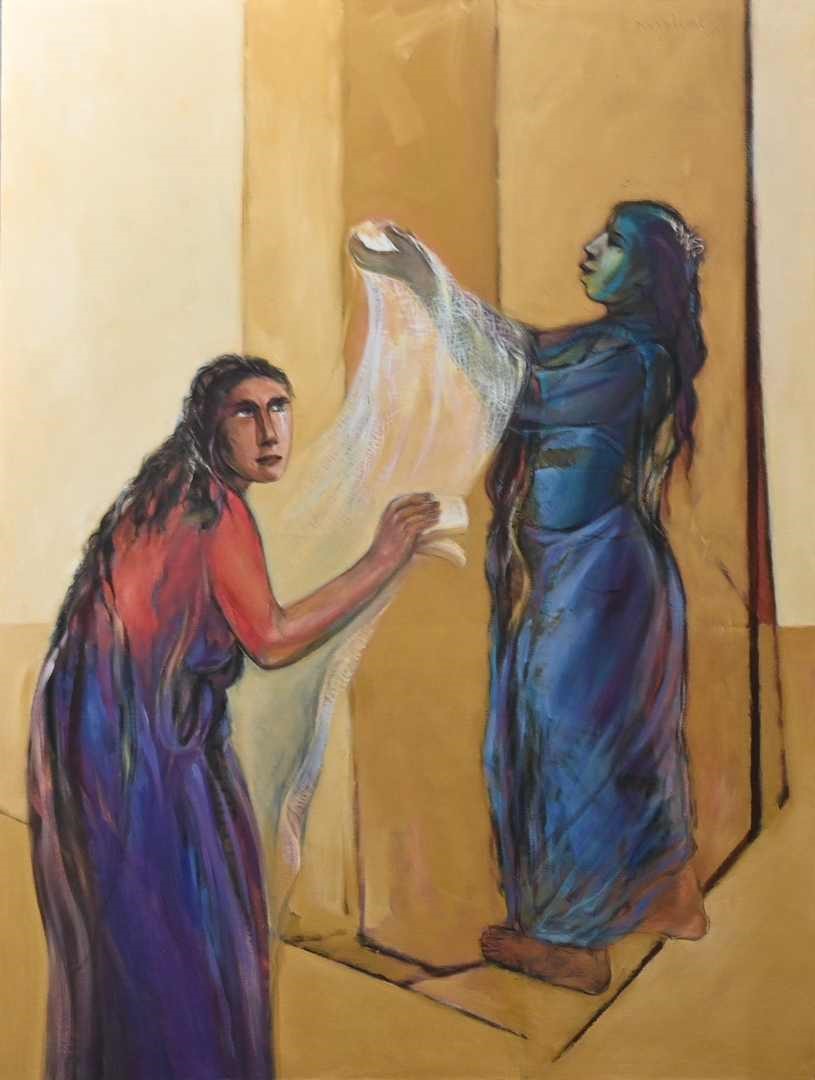 This painting is a thoughtful and expressive piece of modern art, blending traditional influences with a contemporary, emotional style. It shows two women engaged in what appears to be a ritualistic or symbolic moment, set against a muted, earthy backdrop. One woman, in a reddish-brown robe, gently handles a glowing, translucent fabric—possibly a veil or shawl. The other woman, dressed in deep blue or teal, raises the fabric in a gesture that suggests offering or reverence. Their stylized forms and visible brushstrokes reflect elements of expressionism and modern Indian art. The background features a large ochre form, adding depth and balance. The artwork’s rich texture, subtle lighting, and emotional tone create a contemporary, introspective atmosphere, inviting viewers to explore its possible spiritual or cultural symbolism.