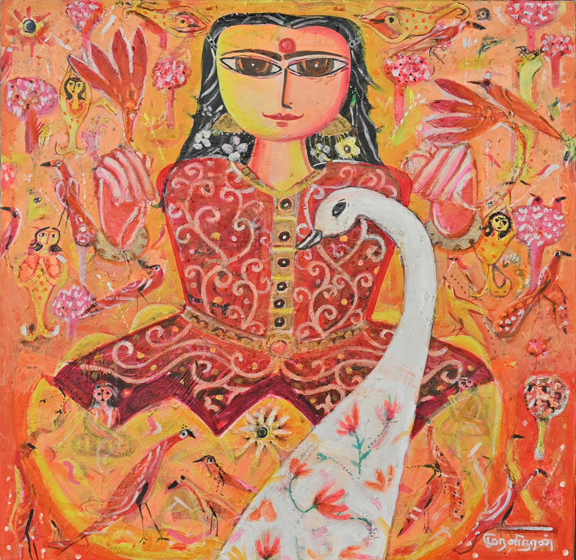 This colorful painting shows a central woman, possibly a goddess or queen, sitting calmly in a magical, dream-like world full of birds and mythical creatures. She wears a red dress with decorative patterns and has a peaceful look on her face, with a red bindi on her forehead. A white swan seems to wrap around her lower body, adding a gentle, spiritual feel. Around her are many small birds, flowers, and fantasy creatures, painted in bright reds, oranges, and yellows. The background is full of energy and detail, with trees, plants, and patterns. The painting style is inspired by Indian folk art—flat colors, bold lines, and lots of repetition. Overall, it feels joyful, mystical, and deeply connected to Indian culture and storytelling.