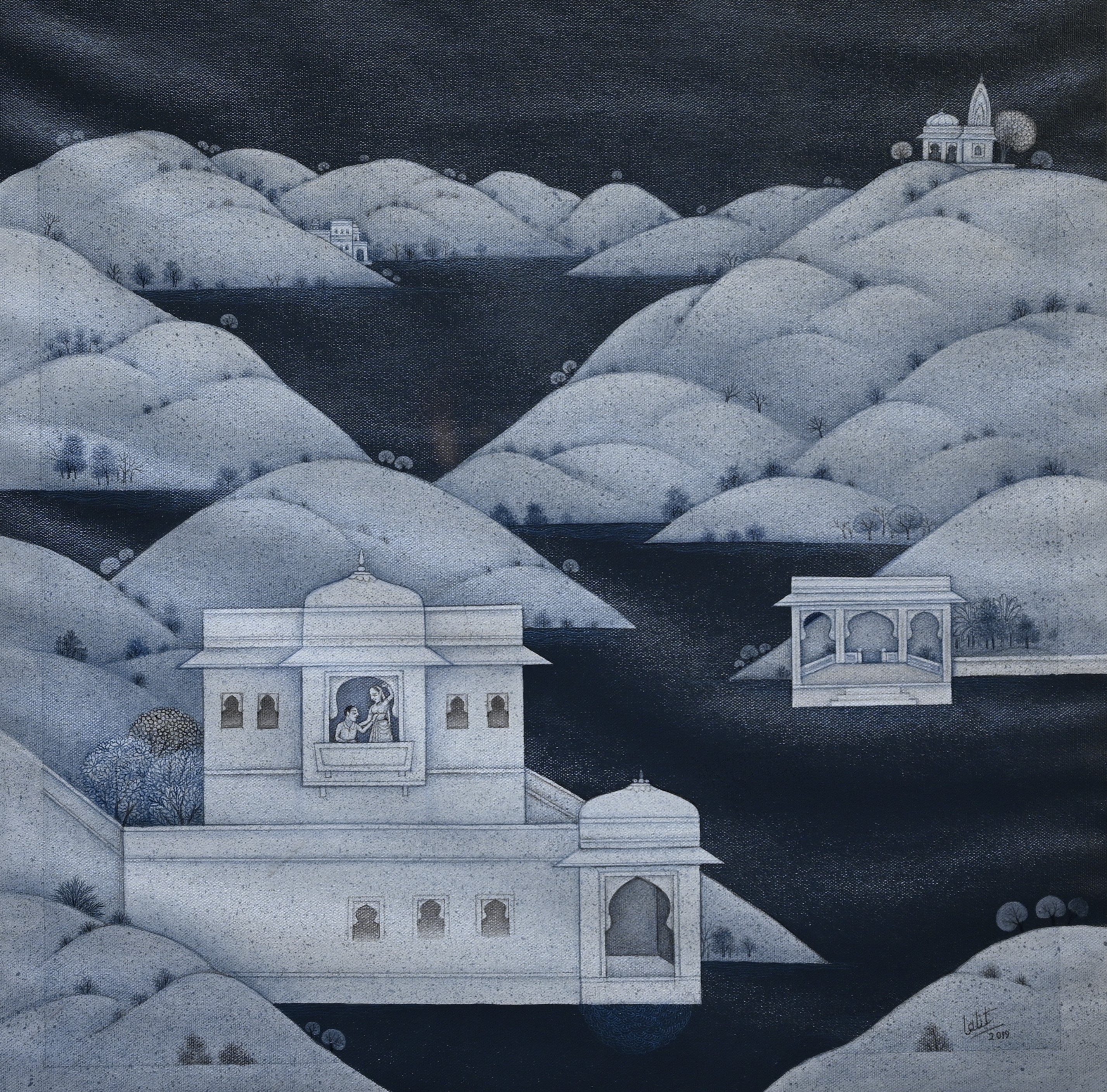 This painting is a serene monochromatic work inspired by Indian miniature traditions, evoking a quiet, dreamlike mood. The landscape is dominated by softly rolling hills painted in shades of grey and white, with a deep dark sky and river weaving through the valleys. At the center stands a palace-like edifice with domed pavilions and arched windows, where a couple is shown in an intimate exchange, leaning from a balcony and sharing a tender gesture.