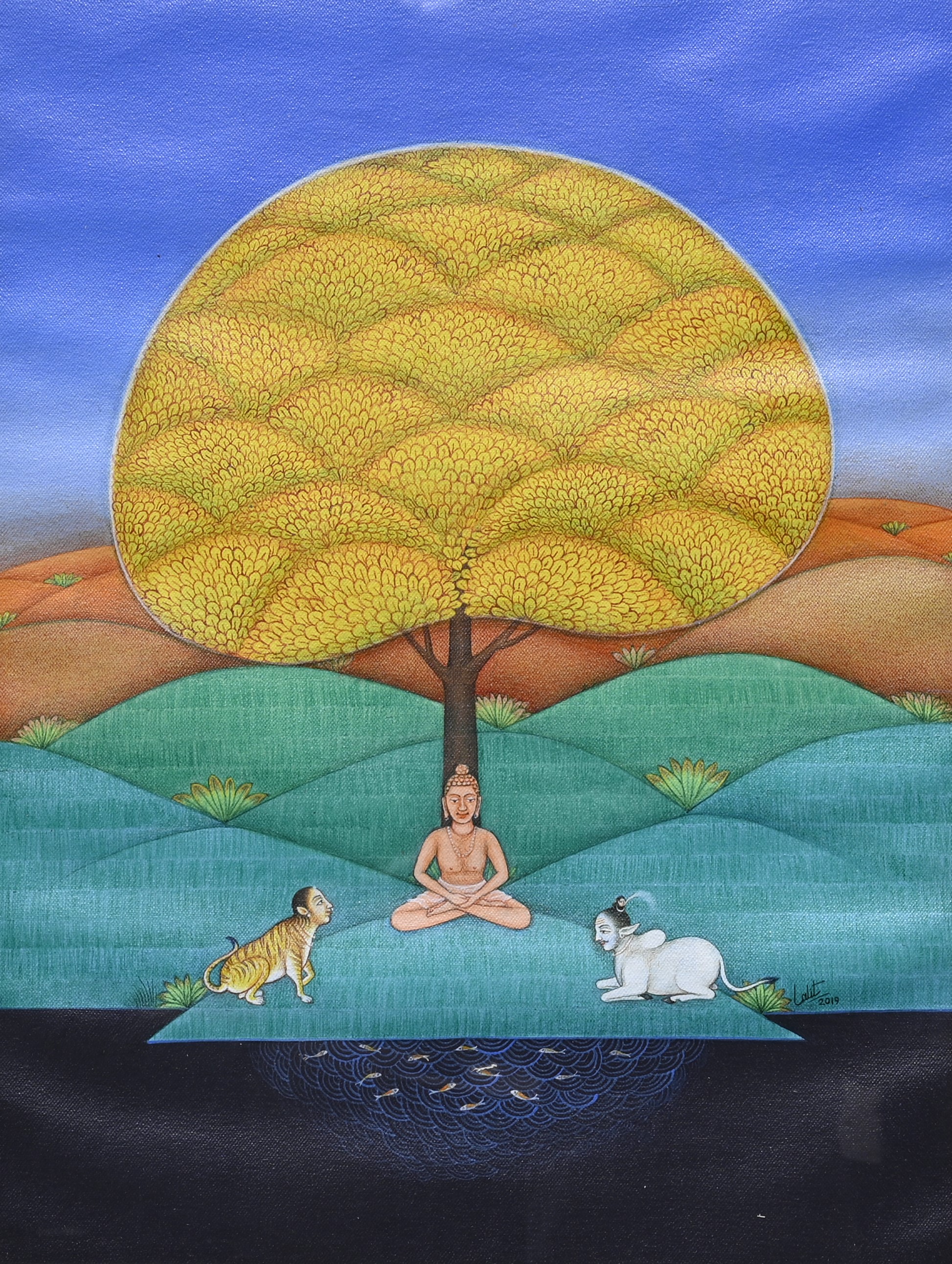 This painting portrays a serene and spiritual scene set in a stylized landscape. At the centre sits a meditating figure beneath a large golden tree, radiating peace and balance. The rounded hills in shades of green and brown create a harmonious backdrop, while the deep blue sky above emphasizes the calm atmosphere. To the left, a tiger approaches with a gentle stance, and on the right, a white bull-like figure sits calmly, symbolizing strength and purity. Below, a pool of swirling blue patterns with tiny golden fish suggests hidden depths of wisdom or the eternal cycle of life. The overall composition conveys themes of meditation, harmony with nature, and the balance between power and tranquility.