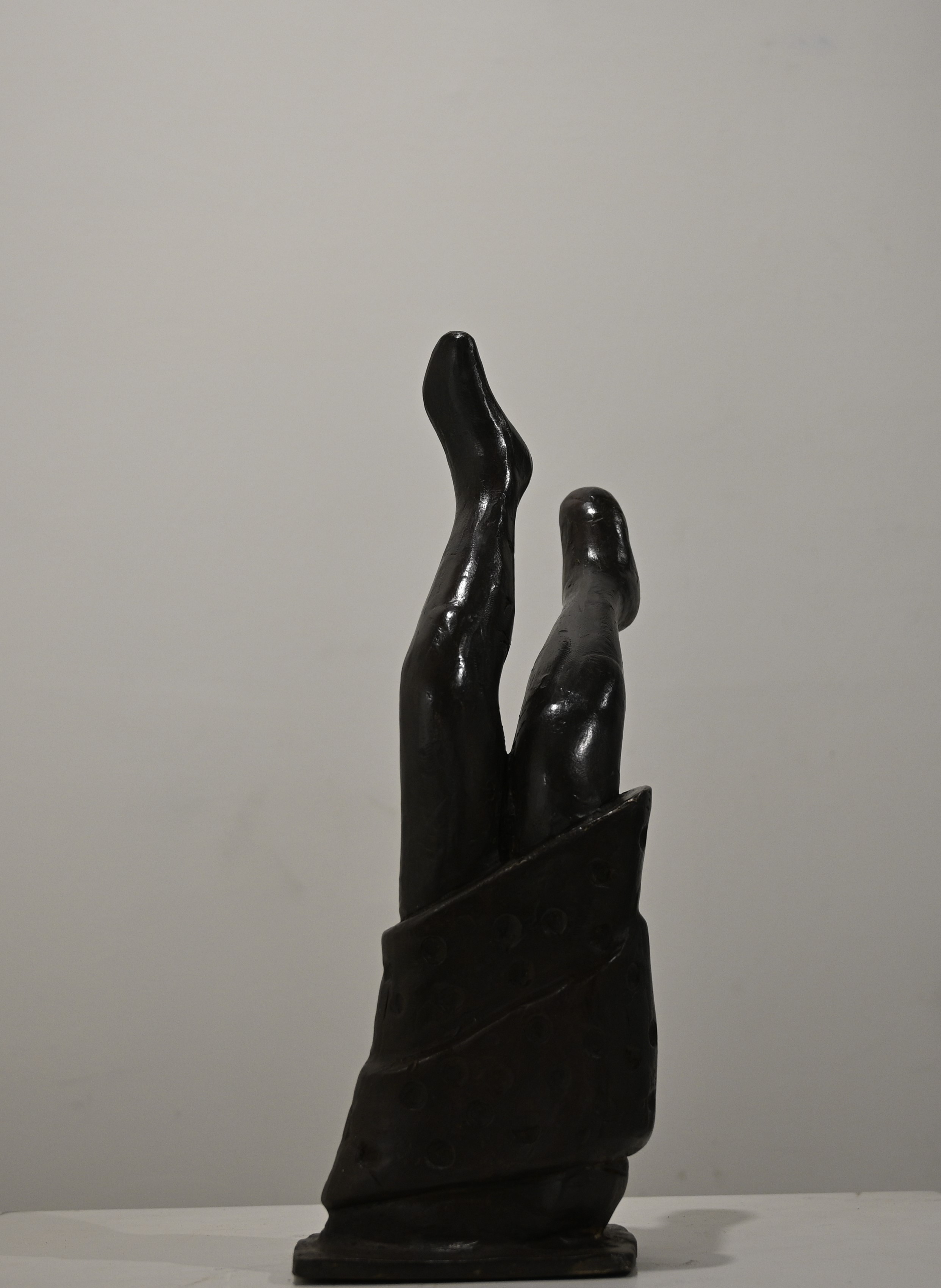 The upward stretch of the figures conveys a sense of aspiration, transcendence, or reaching beyond limitations. The overall effect is elegant and minimalistic, focusing on movement and emotional expression rather than literal representation. The plain background enhances the sculpture’s dramatic presence, drawing the viewer’s attention entirely to its form and symbolism.