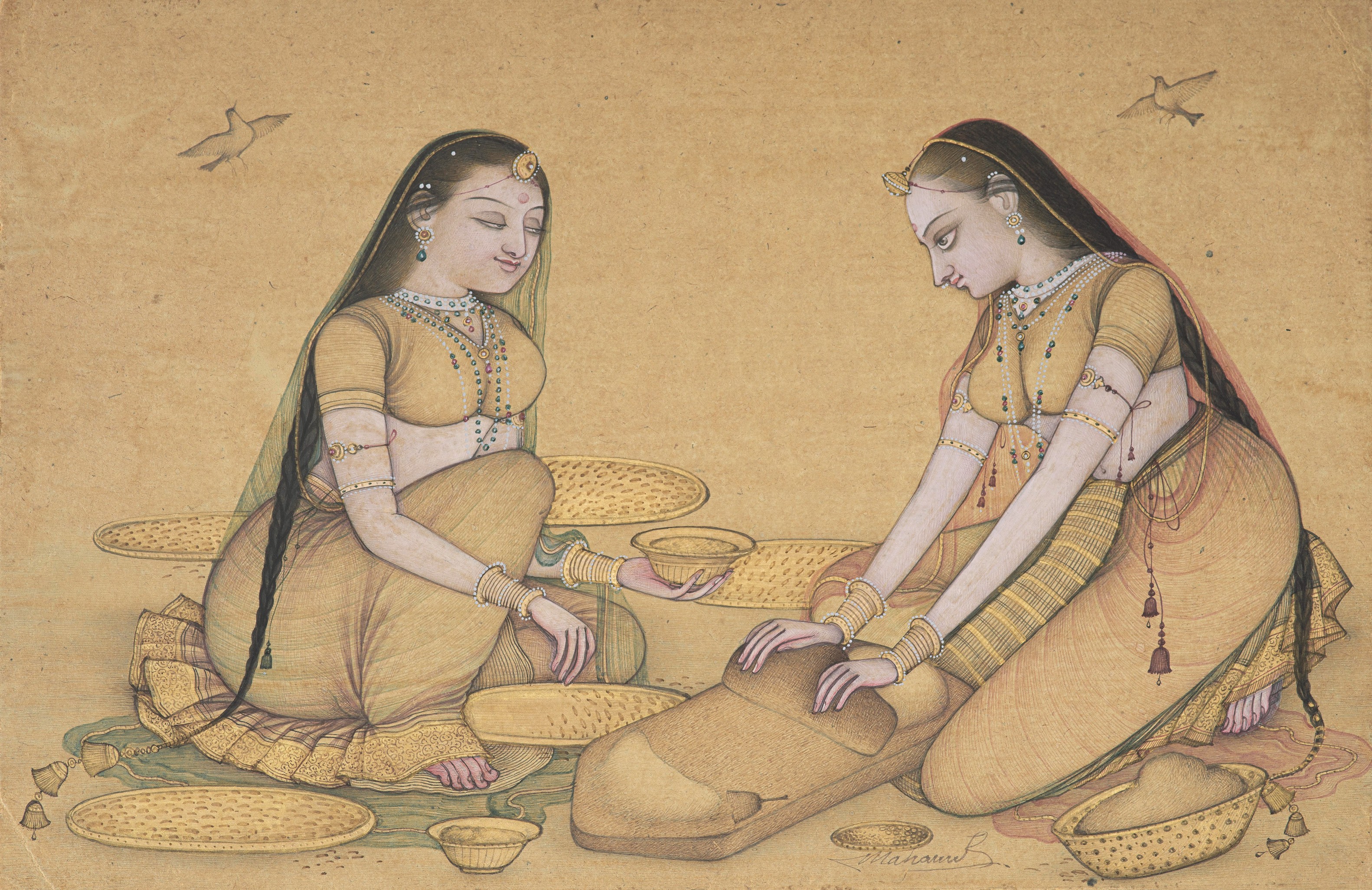 This Mughal-style miniature painting depicts two women engaged in preparing food, likely flour or grain, in a calm domestic setting. The figures are seated in a slightly diagonal, overlapping arrangement, creating harmony and intimacy. Their postures and focused expressions highlight the shared activity, with utensils and containers carefully placed to emphasize the theme.