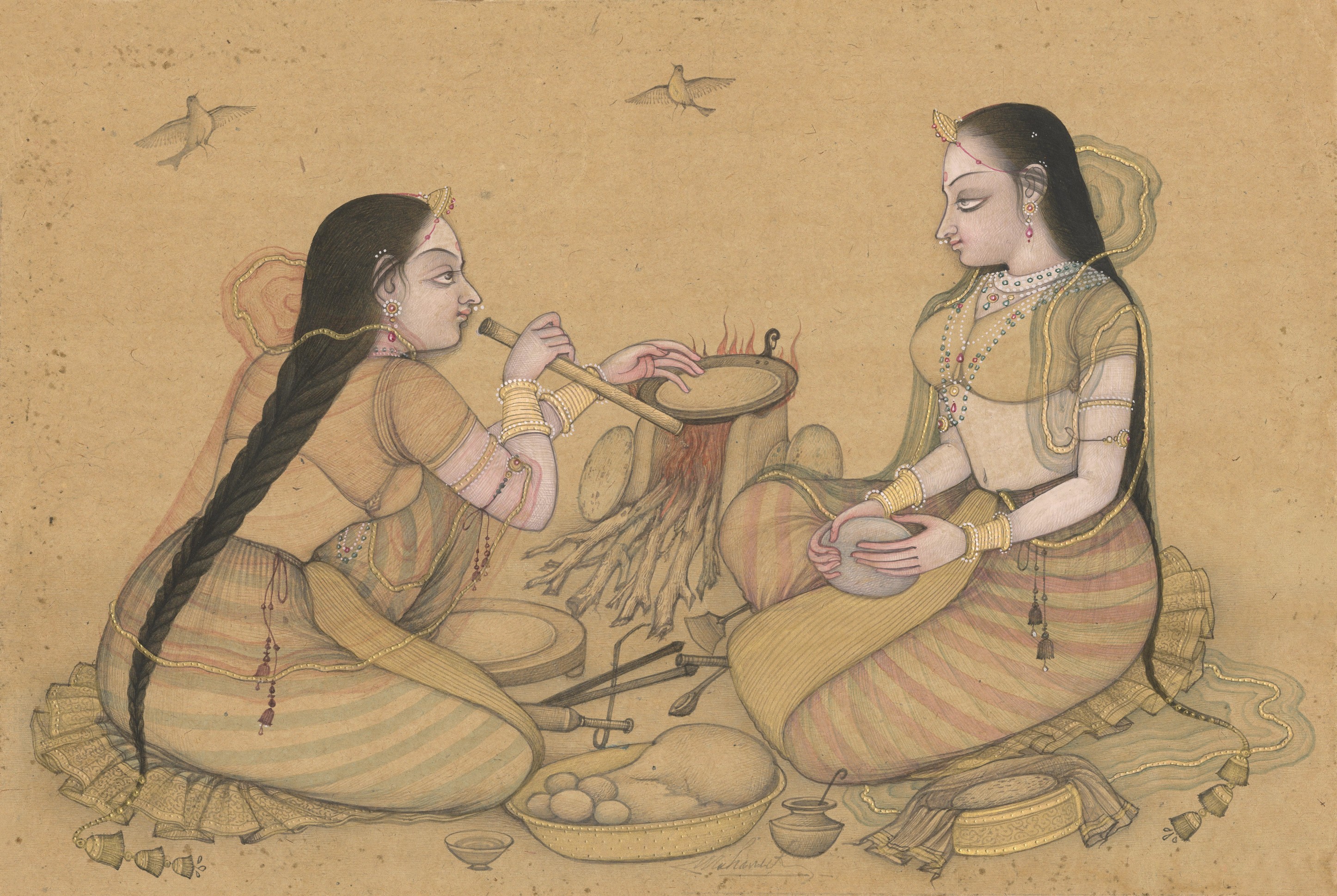 This traditional Indian miniature painting depicts two women engaged in domestic activity near a fire. The figures are arranged horizontally, oriented slightly toward each other, with the act of cooking positioned as the central focus of the composition.