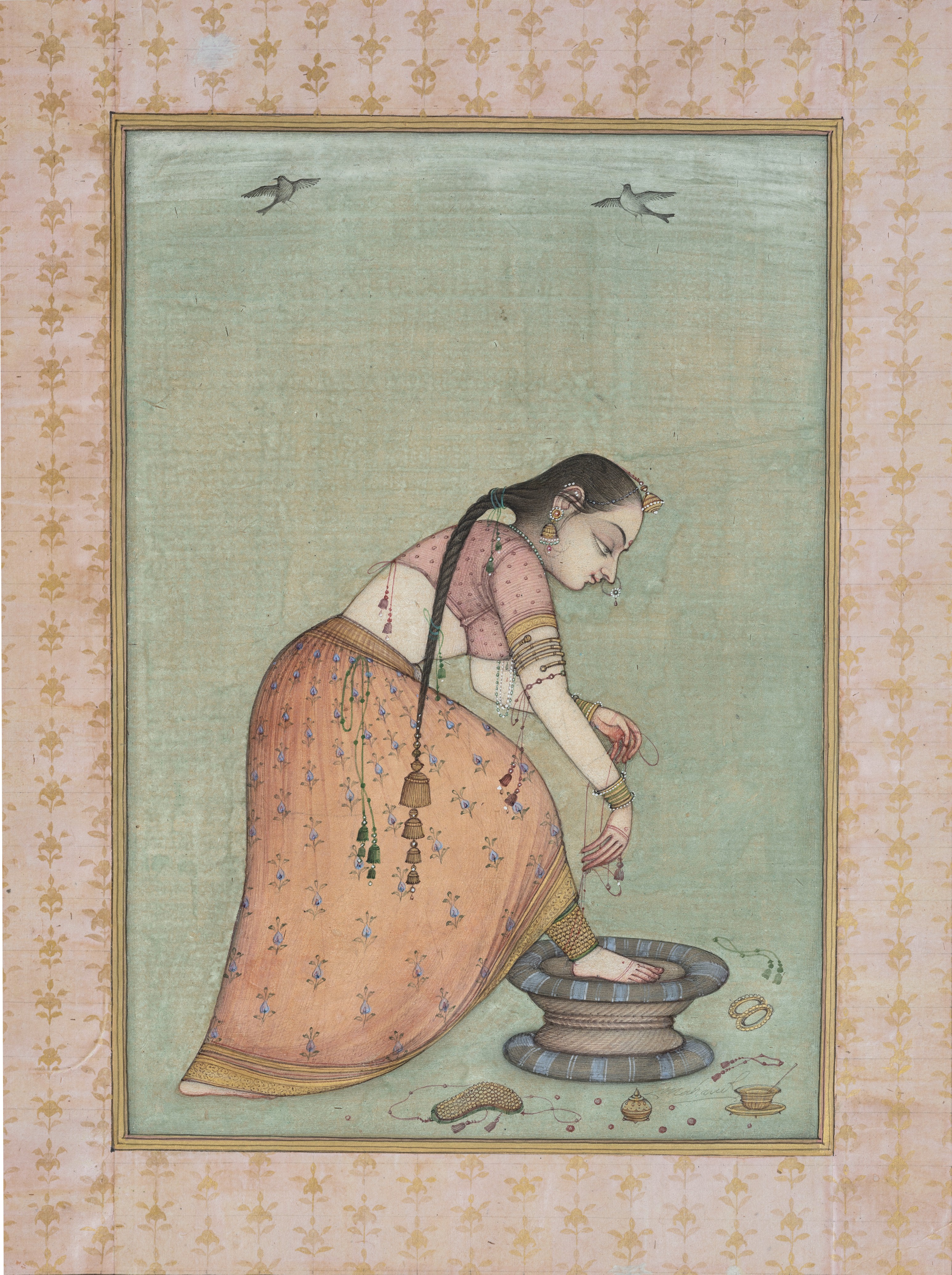 In this miniature, the same young woman is shown in the act of cleansing or preparing herself, bending gracefully over a shallow vessel in which she dips her feet. She wears a soft pink blouse and a flowing orange skirt richly decorated with fine floral patterns, her attire echoing the elegance of the first painting. Her braid, long and ornamented with tassels, once again draws attention to her refined beauty. Jewellery and small vessels are scattered around her, suggesting that she is in the midst of her daily ritual of adornment. The act of washing her feet symbolizes purity, renewal, and readiness, giving the scene both practical and poetic significance. Her lowered eyes and graceful hand gestures express a sense of modesty and serene focus. Above, two birds in flight add balance to the otherwise minimal background, hinting at the gentle passage of time. Framed with a pink-gold floral border, the painting embodies themes of beauty, ritual, and serenity, capturing an intimate, timeless moment of feminine grace.