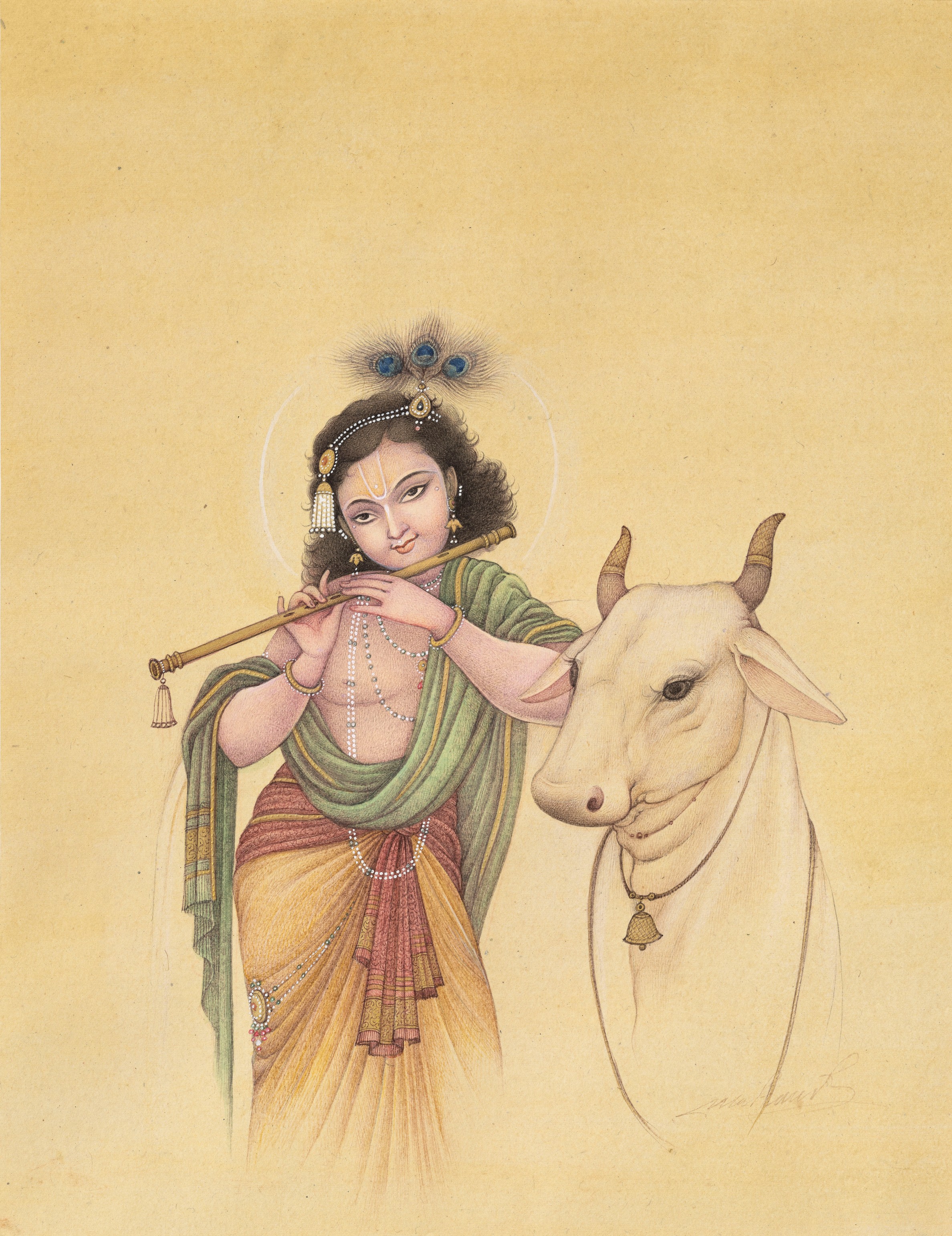 This delicate miniature painting depicts young Krishna playing the flute beside a white cow, rendered with intricate detail and vibrant yet muted colours. Krishna is slightly off-centre, drawing attention with his serene expression and focused posture. The cow occupies the right side, its presence balanced against Krishna, creating a gentle visual rhythm. The interaction between the figures is implied, enhancing the calm atmosphere. Krishna is portrayed as a youthful boy with fair skin, dark hair adorned with peacock feathers, and traditional attire—a green upper garment and golden-yellow dhoti with red bands. He is adorned with necklaces, holding the flute to his lips, a classic iconography of the deity. The cow is shown simply, with clear details of its head and neck. The background, in light beige tones, is subdued, suggesting a serene outdoor setting. Soft, diffused lighting casts subtle shadows, giving depth to the figures. The artist’s fine brushwork captures delicate fabric folds, hair textures, and smooth gradients. The restrained pastel palette adds elegance, while the tight framing emphasizes intimacy. Overall, the painting conveys tranquillity, spirituality, and a moment of peaceful harmony.