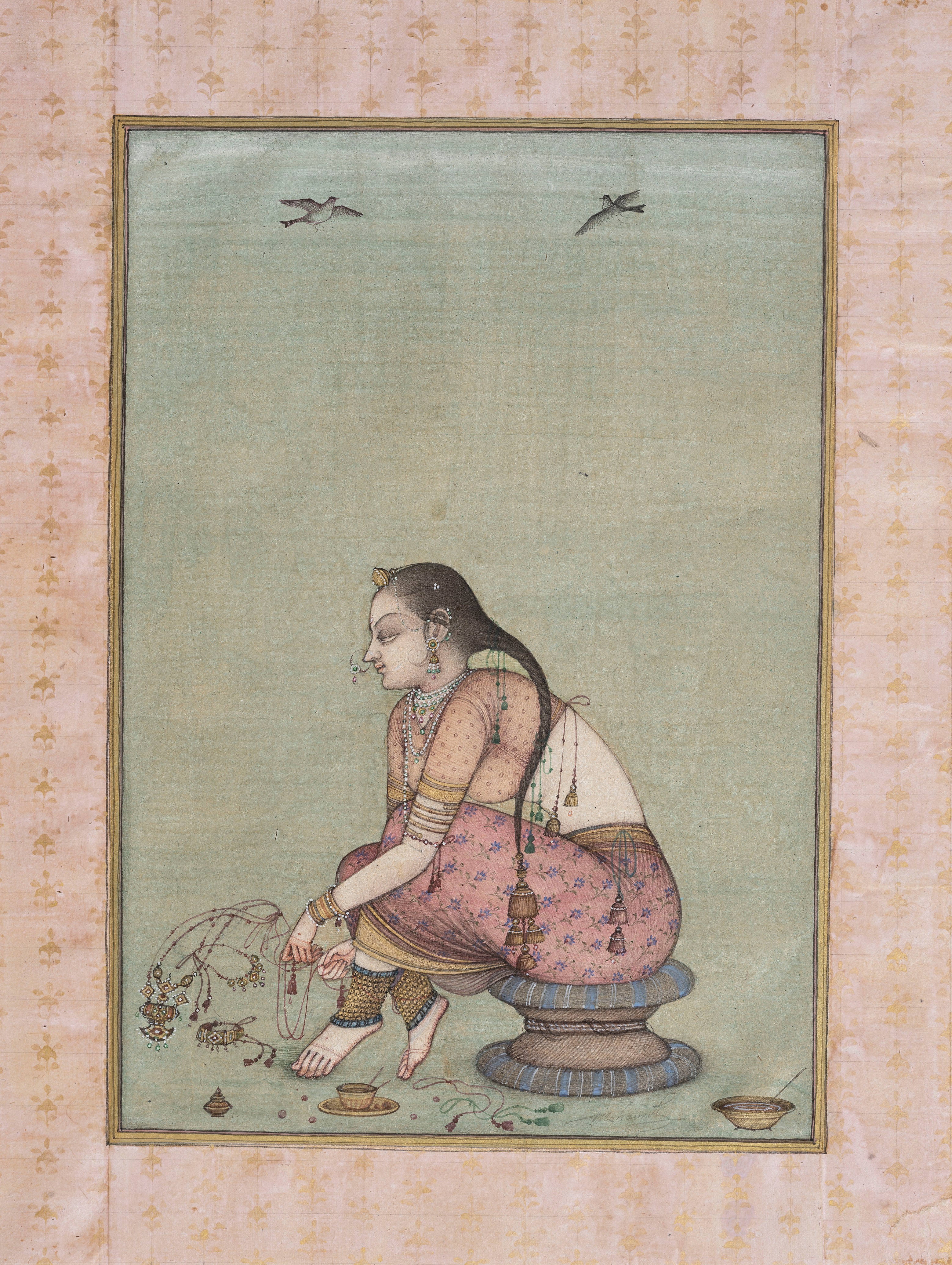 This miniature painting depicts a young woman seated gracefully on a blue cushion, absorbed in a quiet moment of reflection. She wears a transparent pink blouse paired with an orange skirt adorned with delicate floral motifs. Her long braid, decorated with tassels and jewelled ornaments, falls elegantly over her back. The woman is richly adorned with necklaces, bangles, anklets, and earrings, though many ornaments lie scattered on the ground around her, suggesting a pause in her ritual of adornment. Small vessels, perhaps for cosmetics or betel, accompany the jewellery, enhancing the intimate setting. Her slightly forward-leaning posture, paired with her calm expression, conveys an air of longing or contemplation. Two birds fly across the plain green sky, subtly symbolizing freedom and the passage of time. The pink and gold floral border frames the scene, adding refinement to the composition. Overall, the painting highlight’s themes of feminine grace, beauty, and introspection, turning a domestic act into a poetic, timeless moment.