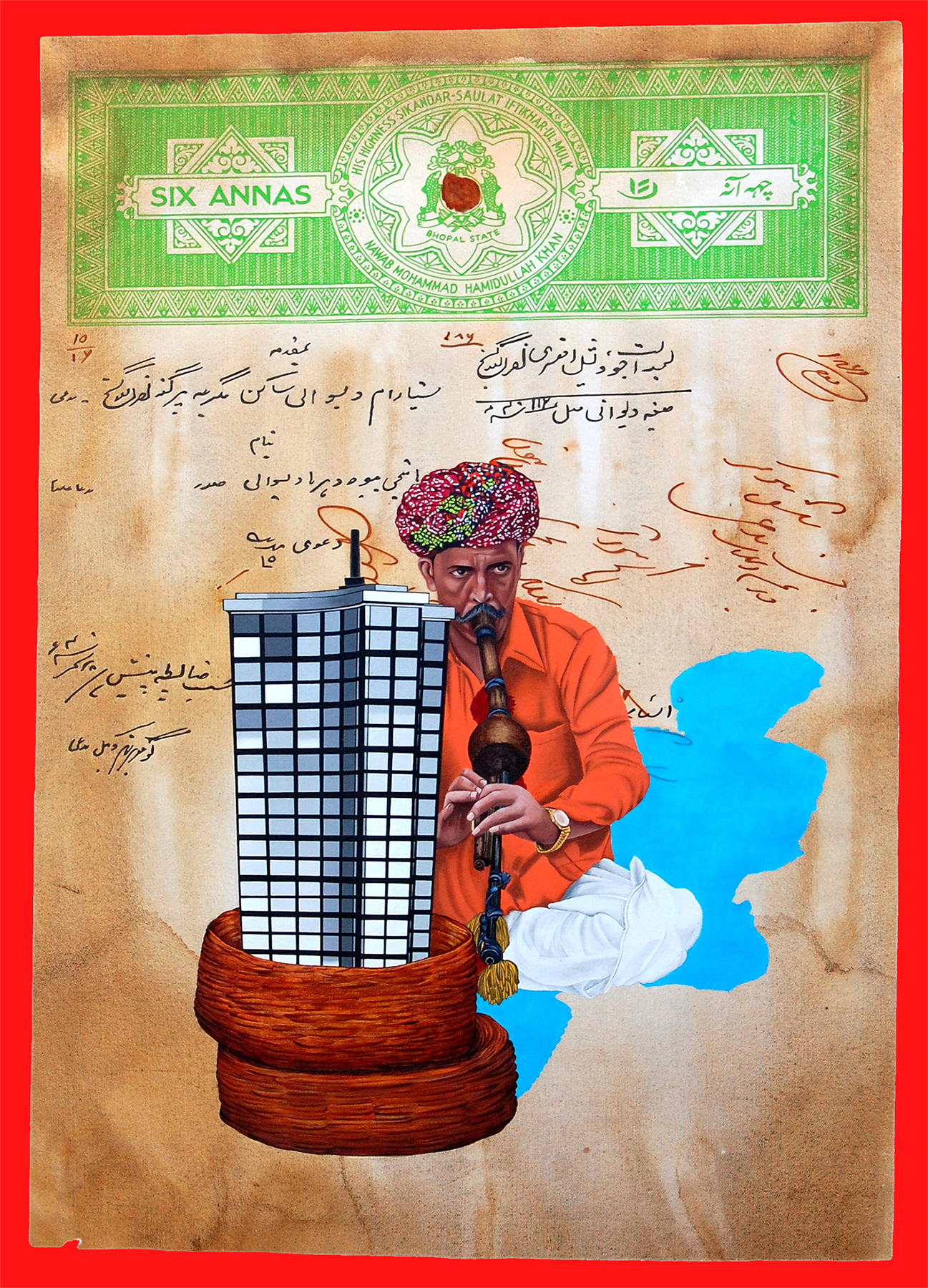 This mixed-media artwork depicts a man in traditional Rajasthani attire seated and playing a flute, with a miniature skyscraper placed before him. The composition positions the man slightly off-centre, while the skyscraper serves as a striking focal point. Behind them, handwritten text and a stamp form the background, suggesting the surface of a document or certificate.