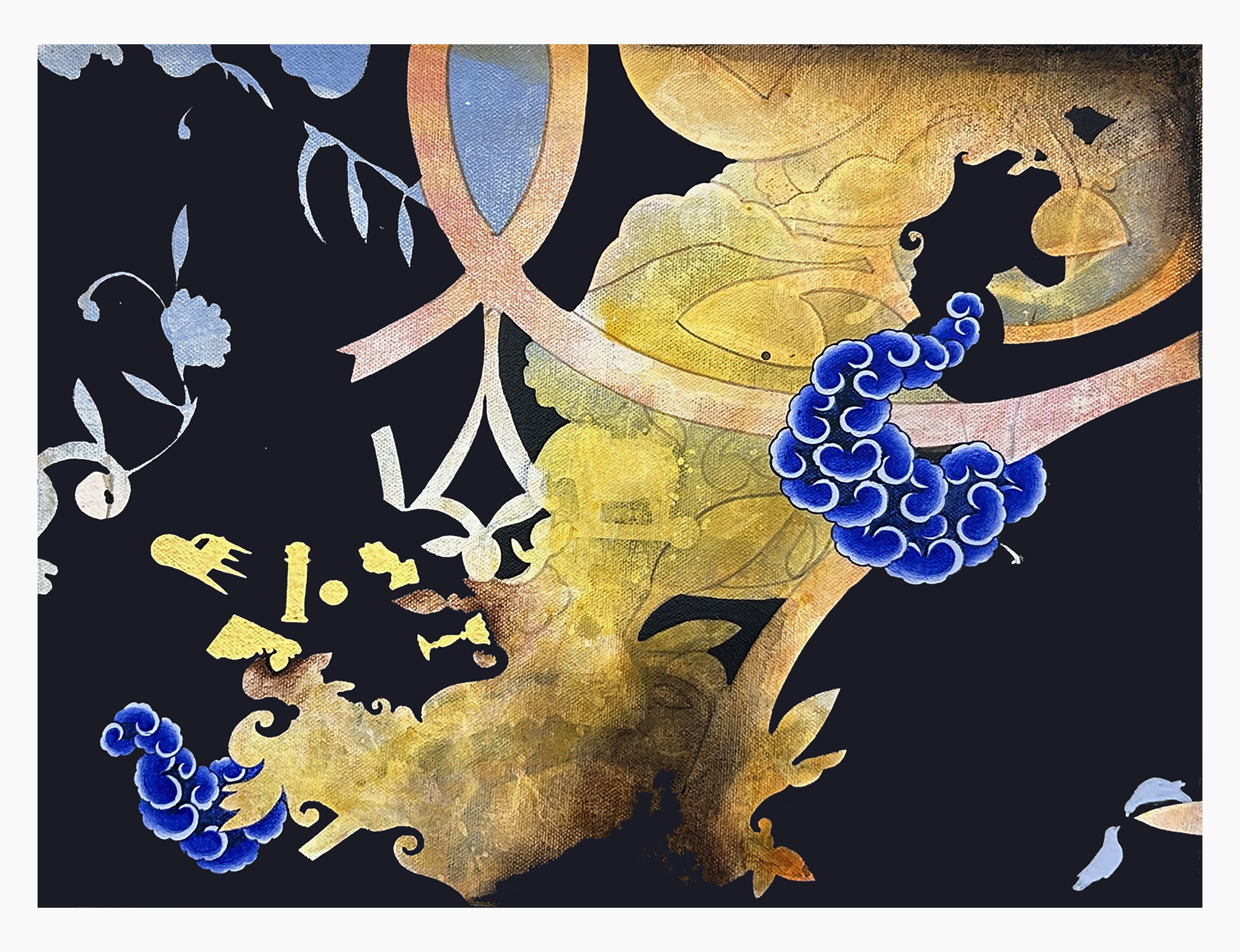 Altogether, the piece conveys elegance and layered symbolism—nature, ornament, and dreamlike fragments unified in a dramatic play of warm golds and cool blues against a black ground.