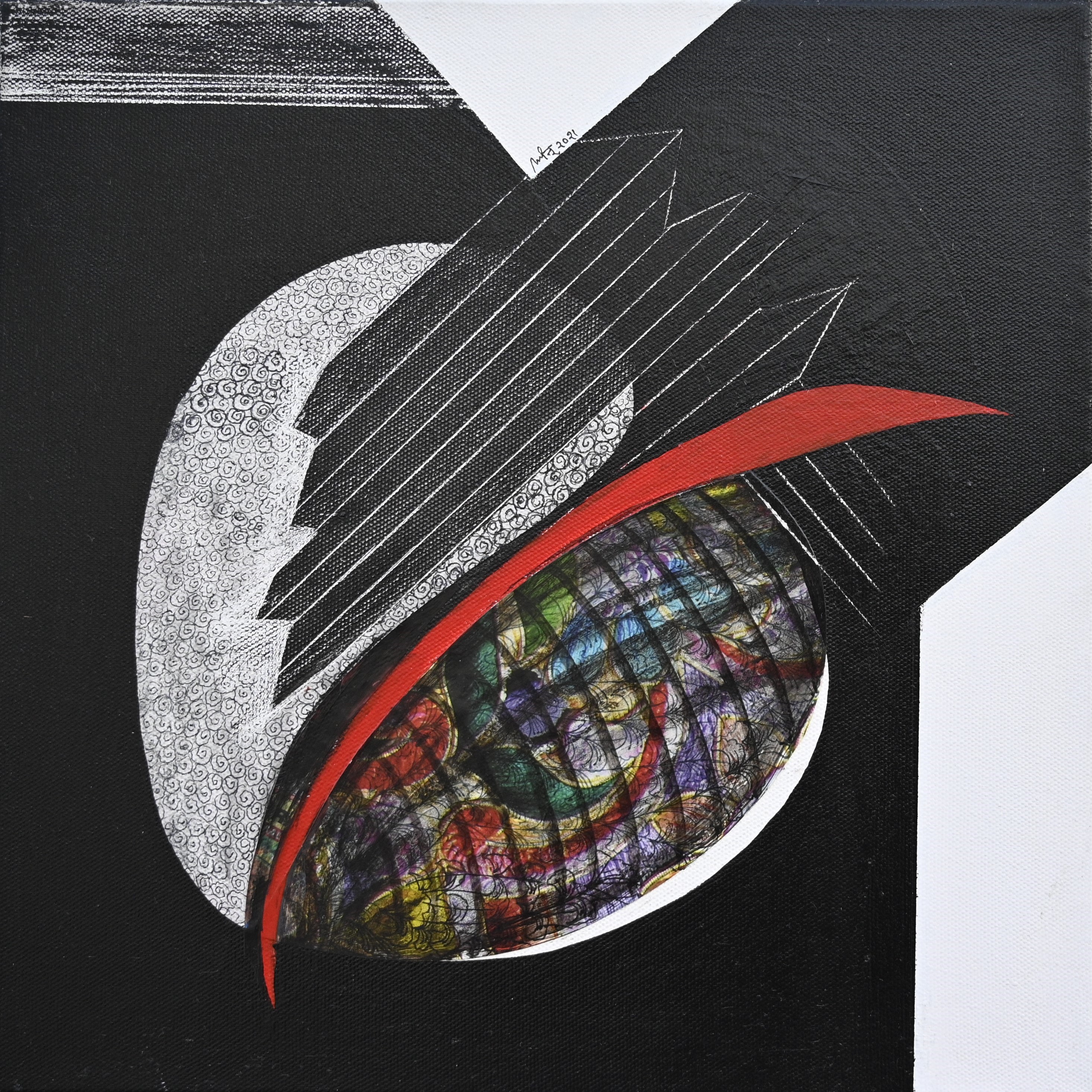 The lower segment features a dome-like structure brimming with a mosaic of colors—reds, purples, greens, and yellows—interlaced with black, web-like lines. This richly textured zone resembles a stained-glass surface or an abstracted eye, adding depth and complexity. Geometric shapes and clean divisions between black and white areas lend the piece a sense of order amidst its expressive detailing. The composition feels architectural yet organic, abstract yet intentional. The piece embodies a subtle harmony of contrasts, uniting tension with equilibrium and movement with quiet stillness. . The overall effect is bold and enigmatic, encouraging the viewer to explore its intricate layers and forms.