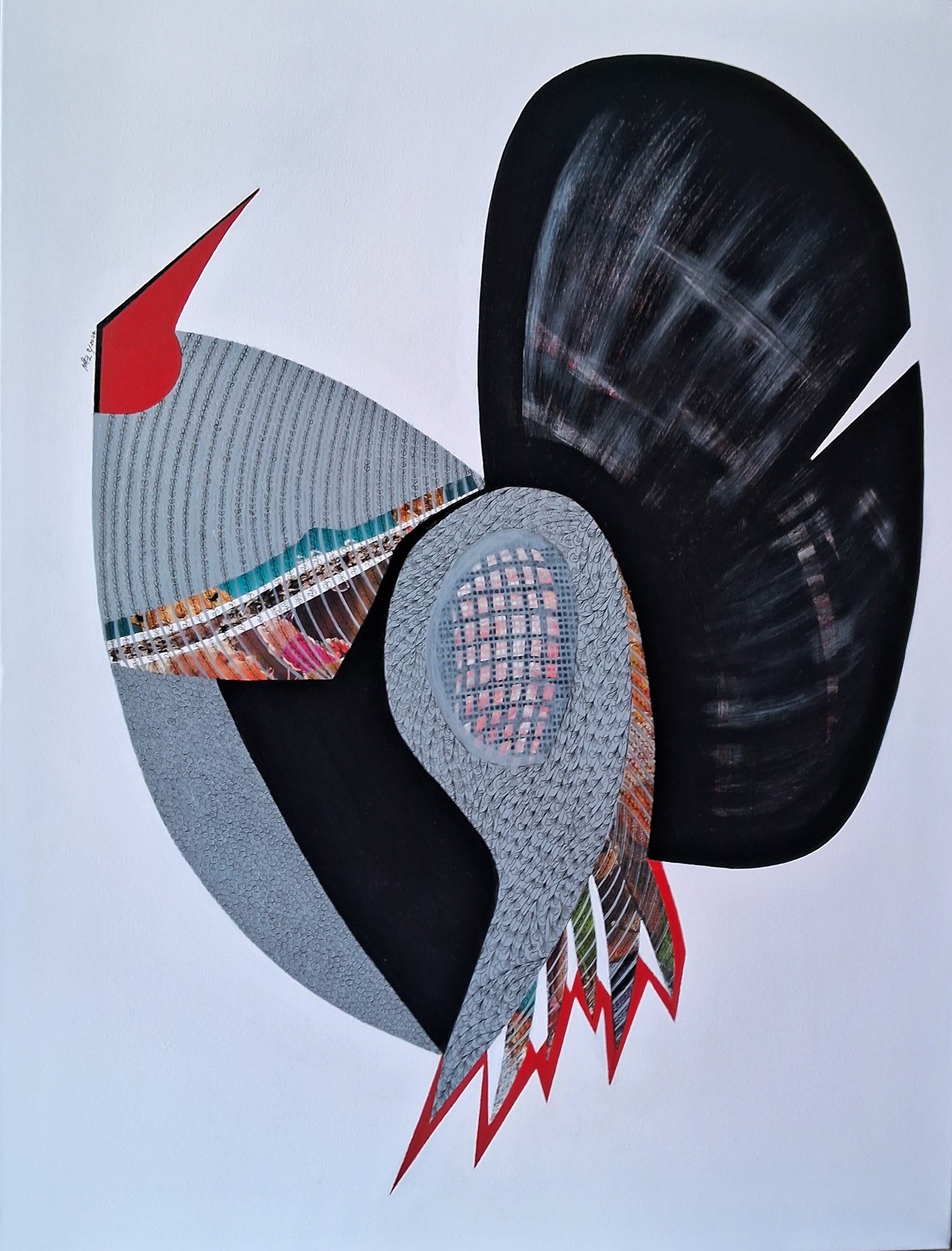 This artwork presents a vivid modern depiction of a rooster, executed in a bold, abstract manner. The artwork combines geometric forms and intricate textures to create a stylized representation of the bird. Dominated by shades of black, grey, and red, the composition also incorporates subtle accents of color such as turquoise, pink, and orange, adding depth and vibrancy. The rooster's comb and beak are sharply defined in vivid red, contrasting against the more subdued tones of the body. The feathers are depicted using patterned and repetitive lines, giving a sense of movement and detail, while the large, black tail features expressive brush strokes that add texture and dimension. Set against a plain white background, the subject stands out with a powerful visual presence. The overall effect is a harmonious blend of modern design and traditional subject matter, showcasing a unique and creative interpretation of the rooster form.