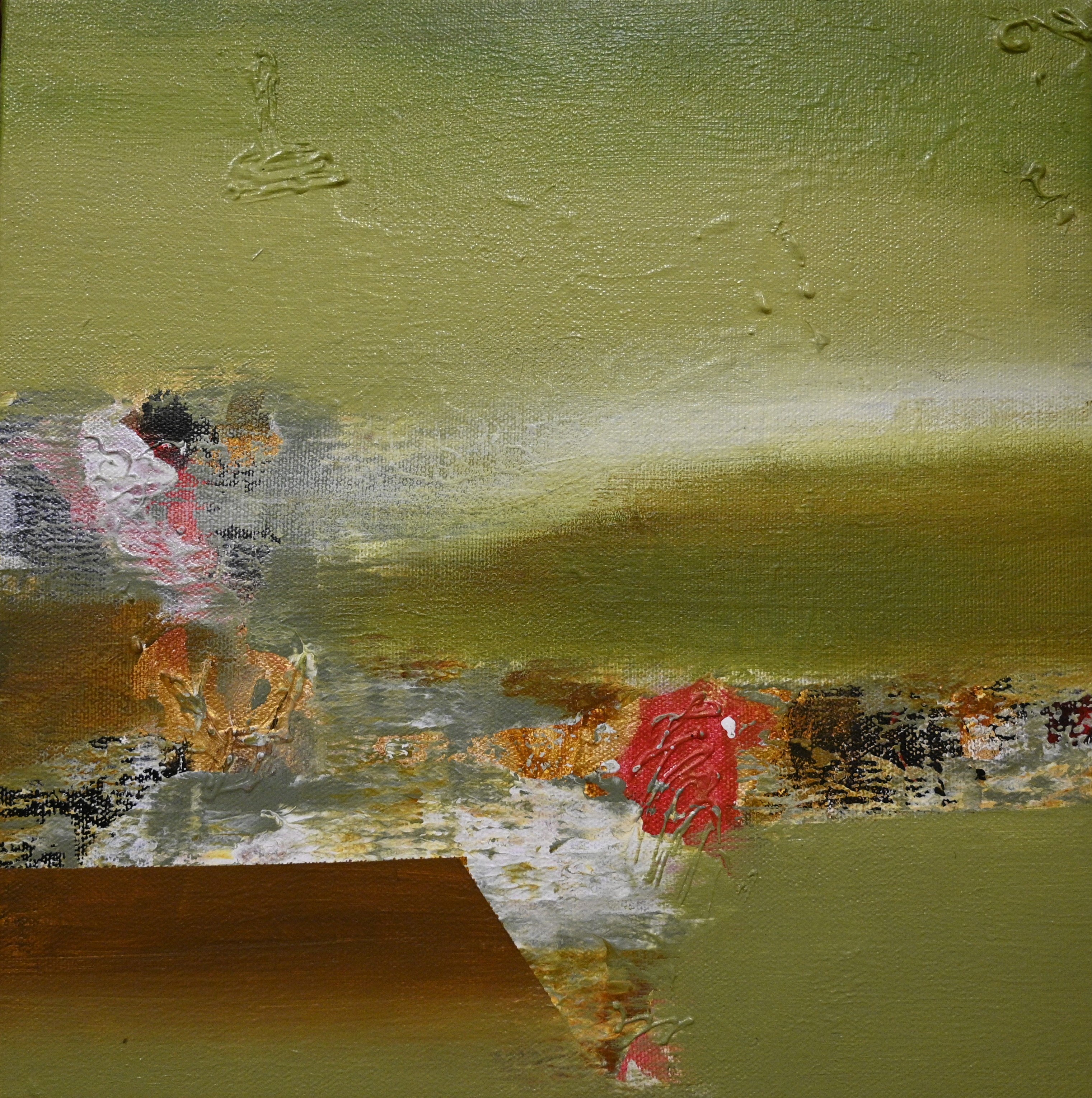 This abstract painting shifts into a warmer, earthier palette, with dominant shades of olive green, ochre, and brown, suggesting a grounded and organic atmosphere. The composition is horizontally oriented, with broad, sweeping brushstrokes that create a sense of movement across the canvas, almost like a landscape or horizon. In the lower half, textured elements and splashes of bright red, orange, and pink punctuate the earthy tones. These accents are layered with thicker paint and mixed media, adding visual interest and tactile richness. One striking red form near the center appears almost floral or organic, drawing attention amidst the more subdued surroundings. There are also hints of metallic or reflective textures — perhaps gold or bronze — adding a shimmer to certain sections and creating contrast against the matte greens. The upper half of the painting is relatively smooth and less populated, which offers a calming negative space that balances the more active bottom. Geometric influence appears in a sharp, angular brown shape in the lower left corner, introducing an architectural or structural element to the otherwise fluid composition.