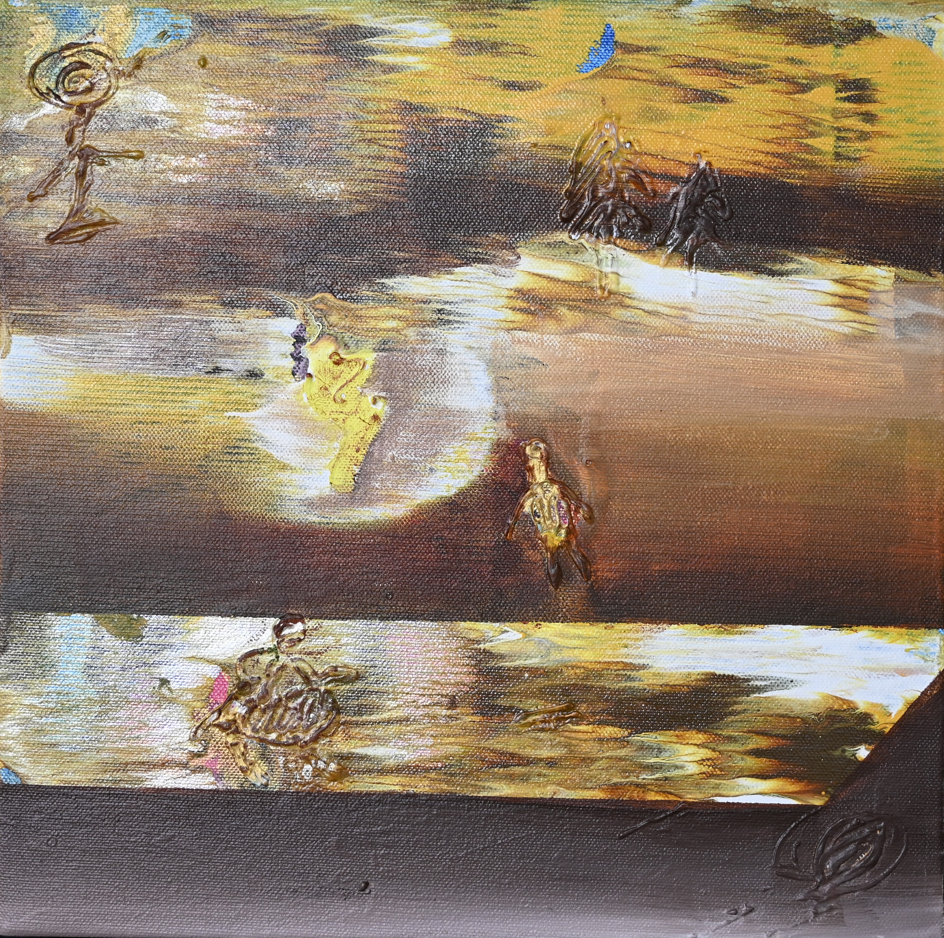 The painting conveys a symbolic and enigmatic mood, merging layers of abstraction with subtle figurative suggestions.