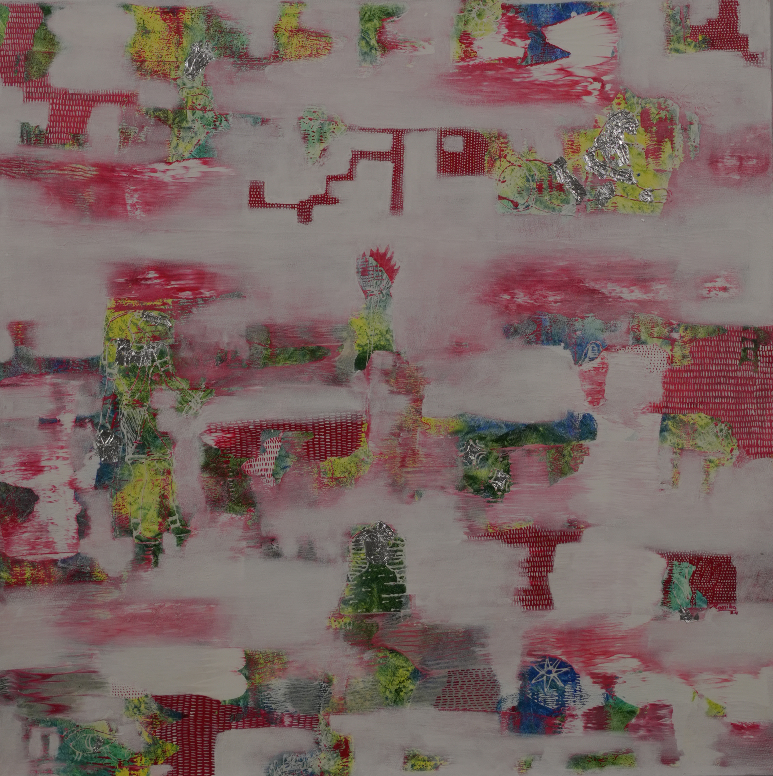 This mixed media artwork by Monika is a vibrant and layered abstract piece. It blends soft pinks, greens, reds, and silver foil with delicate textures and dotted patterns. The brushwork appears misty and blurred, giving a dreamy effect, while patches of bright color and fabric-like motifs create contrast and depth. The painting invites the viewer to explore its many layers and discover hidden forms and stories within it. Monika, born in 1977 in Pali, Rajasthan, is known for her colorful abstract works rich with detail and texture. Her art reflects a unique combination of tradition and modern expression.