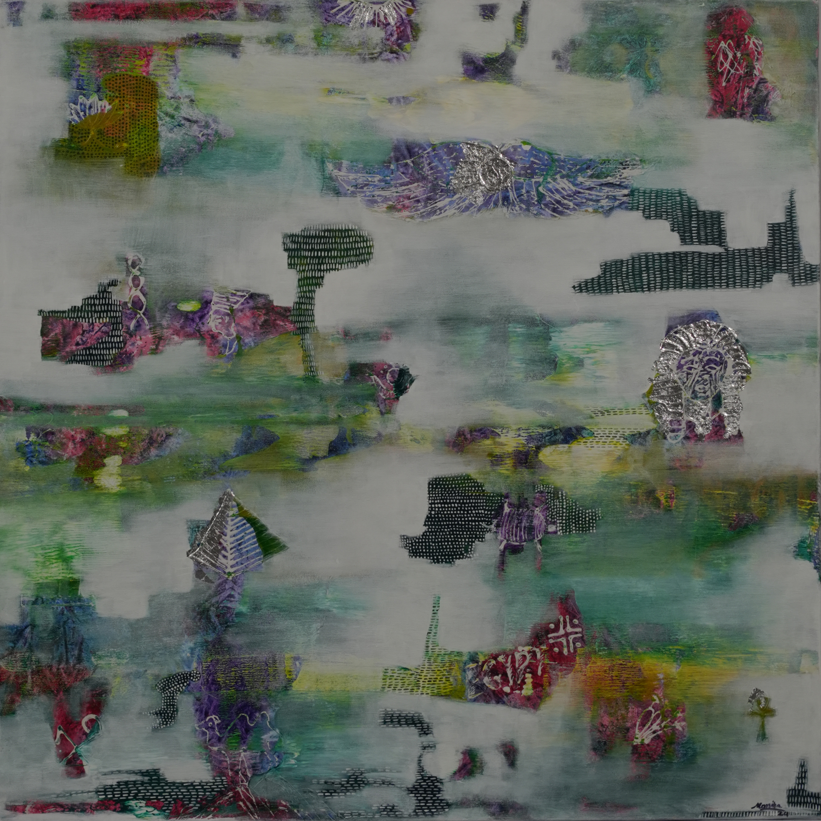 This artwork by Monika Sharda is created using mixed media on canvas. It shows soft layers of green, blue, and yellow colors, mixed with bright shades like magenta and purple. Shiny silver textures and detailed patterns appear in different parts of the painting. The artwork feels calm and dreamlike, as if the shapes are floating in a peaceful space. Monika uses many layers and materials to add depth and interest. Her use of color, texture, and design creates a beautiful balance, making the artwork both relaxing and exciting to look at.