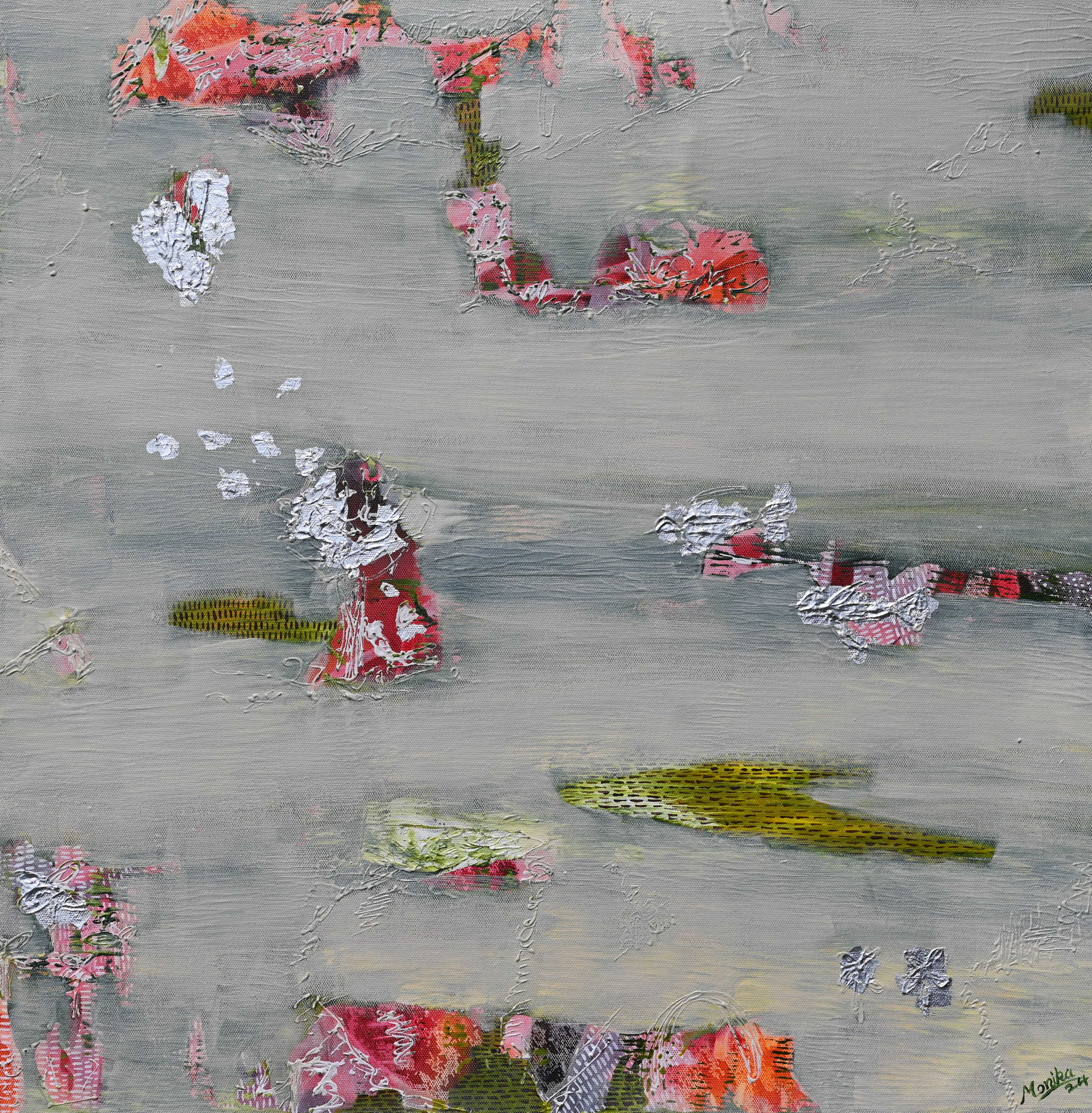 This image appears to be an abstract painting that uses a combination of textures and colours to create a layered, complex visual experience. The background is dominated by soft, muted grey tones, which give the piece a calm and neutral foundation. Over this base, vibrant patches of red, pink, orange, and green appear sporadically across the canvas, creating stark and vivid contrasts. These patches look almost like torn fabric or textured paper, some of which are outlined or overlapped by white paint, giving a three-dimensional effect. Hints of mesh-like textures and fine detailing in yellow-green and olive tones add to the tactile feel of the piece. The brushstrokes are fluid but intentionally rough in places, contributing to the dynamic nature of the painting. The fragmented, collage-like arrangement suggests a sense of disruption or transformation, and the irregular distribution of colours and textures leads the eye around the canvas without a clear focal point. In the bottom right corner, the artist's signature, “Monika,” is visible, suggesting the creator’s personal touch on this abstract composition. The work evokes feelings of decay and renewal, disorder and design, blending natural and artificial aesthetics
