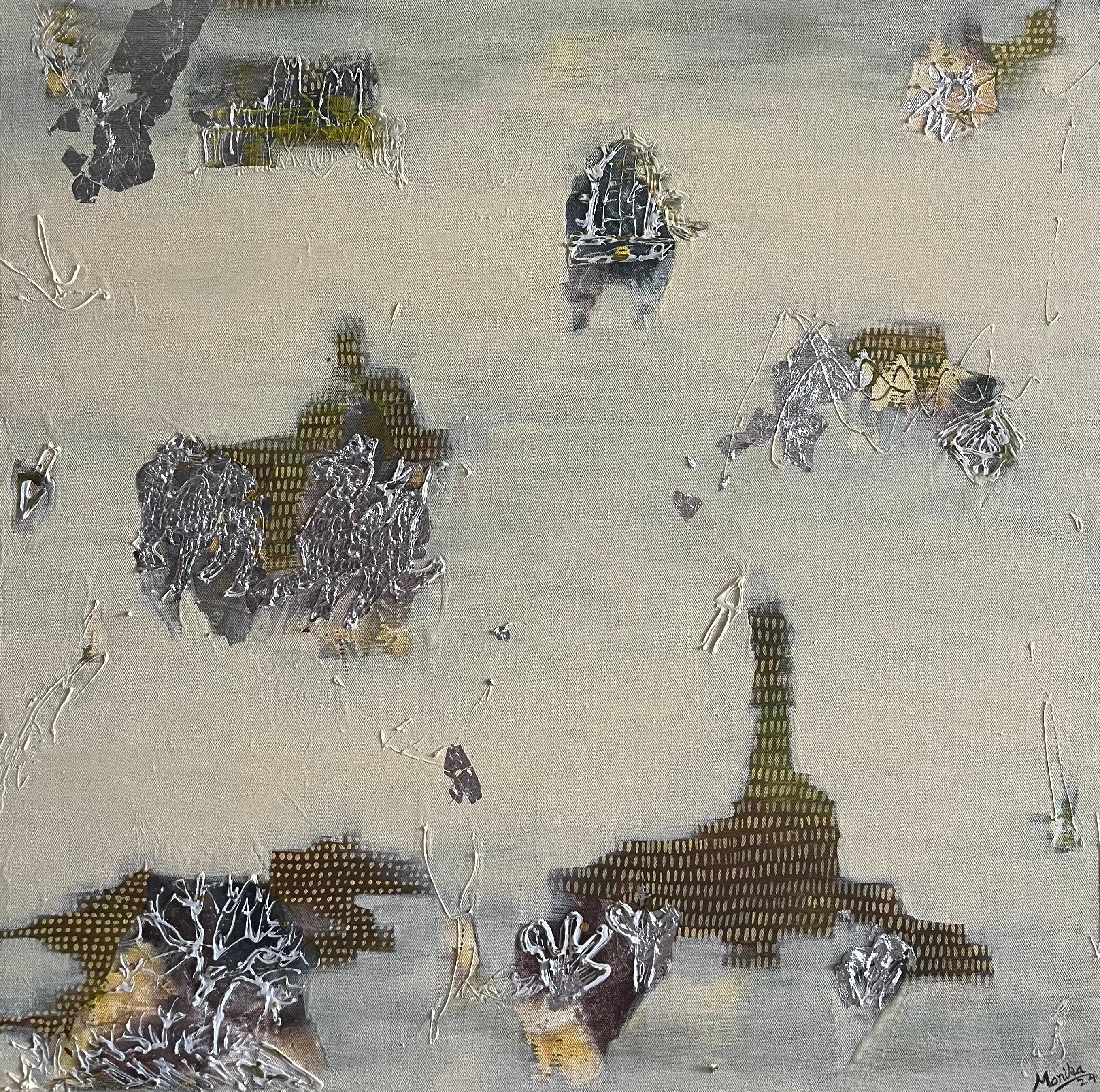 Set against a lightly textured background, the forms appear to float — as though suspended in time. Golden grid patterns and delicate white impasto gather in scattered clusters, evoking ancient ruins, fossils, or fading architectural details. These worn textures suggest revelation, as if long-buried fragments are surfacing.