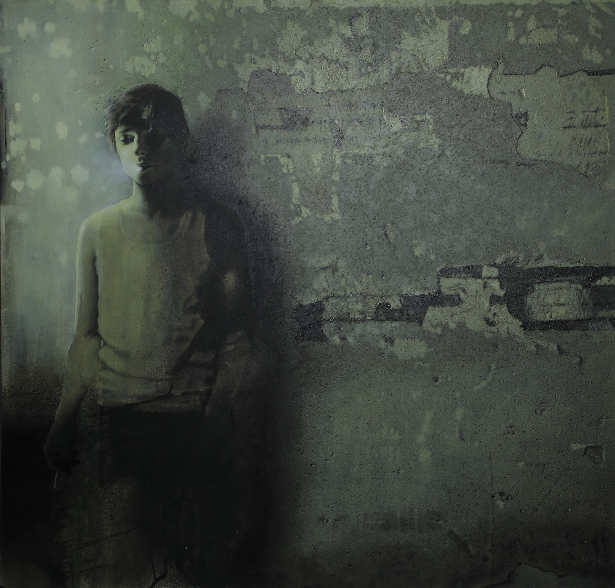 This painting by Prasenjit Sengupta portrays a young person standing against a weathered, textured wall, rendered in a muted palette of greenish-grey, brown, and soft grays. The figure, with short dark hair and a sleeveless top, is softly outlined with a slightly blurred quality, lending a dreamlike or memory-like atmosphere. Their expression is ambiguous—hovering between sadness and resignation—and their gaze is turned slightly away, evoking a deep sense of introspection. A thin wisp of smoke rises from a cigarette or similar object in their hand, further contributing to the moody, melancholic tone. The decaying background wall, with its cracks and discoloration, reinforces the themes of age, neglect, and solitude. Soft, diffused lighting adds depth and subtle shadows, enhancing the overall feeling of quiet contemplation and emotional isolation.